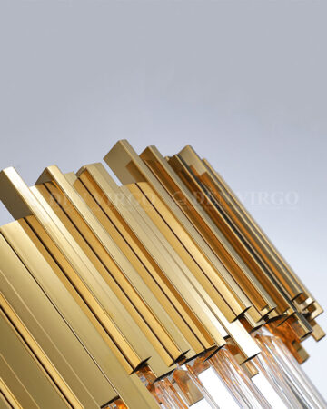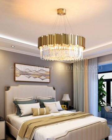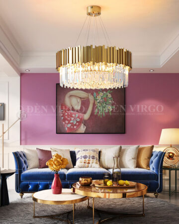 - Bộ đèn thiết kế theo phong cách Bắc Âu tối giản trong hình dáng, vẻ đẹp tương phản giữa màu vàng bóng sang trọng và pha lê tinh khôi.