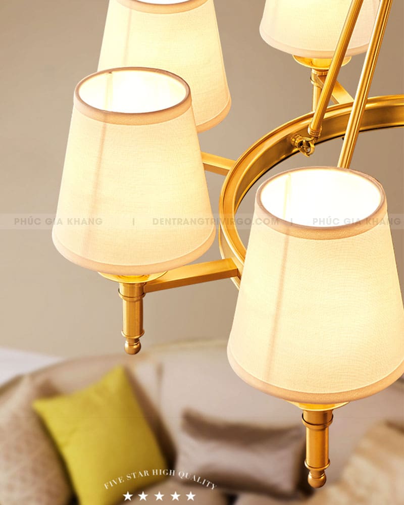 Vải là vật liệu được ưa chuộng hiện nay được sử dụng đẹp mắt trên Đèn chùm đồng chụp vải cổ điển VIRGO LA1579. Vải với các đặc tính trong suốt và truyền sáng tốt, nhẹ và cứng cáp, giúp tạo được kiểu dáng vô cùng thú vị cho bộ đèn.