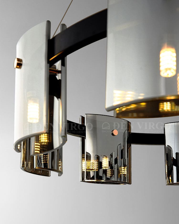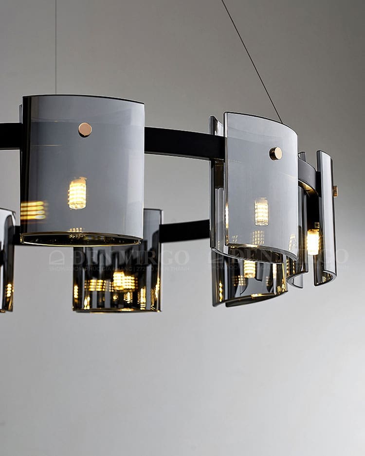 - Thiết Kế Hình Khối Hiện Đại: Đèn nổi bật với cấu trúc vòng tròn khung kim loại màu đen, bao quanh là các khối hộp hoặc thanh thủy tinh màu đen (khói) được sắp xếp một cách nghệ thuật, tạo nên sự tương phản độc đáo giữa ánh sáng bên trong và vẻ ngoài mạnh mẽ.