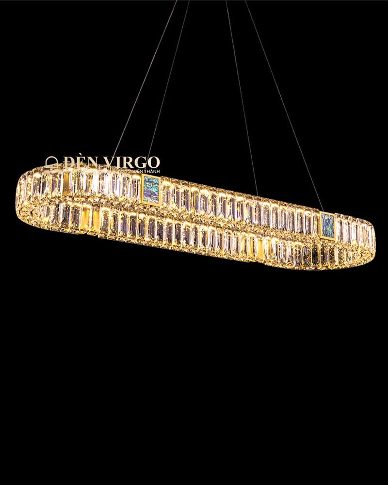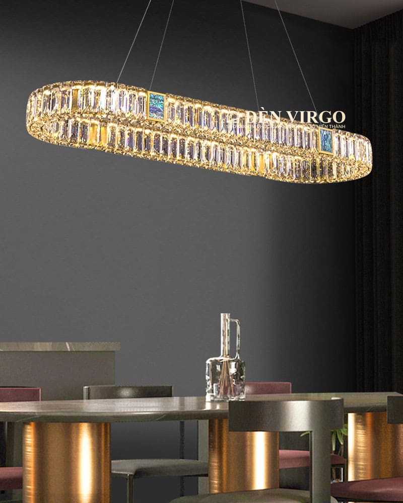 Pha lê là vật liệu được ưa chuộng hiện nay được sử dụng đẹp mắt trên Đèn thả pha lê trang trí bàn ăn cao cấp LH6362. Pha lê với các đặc tính trong suốt và truyền sáng tốt, nhẹ và cứng cáp, giúp tạo được kiểu dáng vô cùng thú vị cho bộ đèn.
