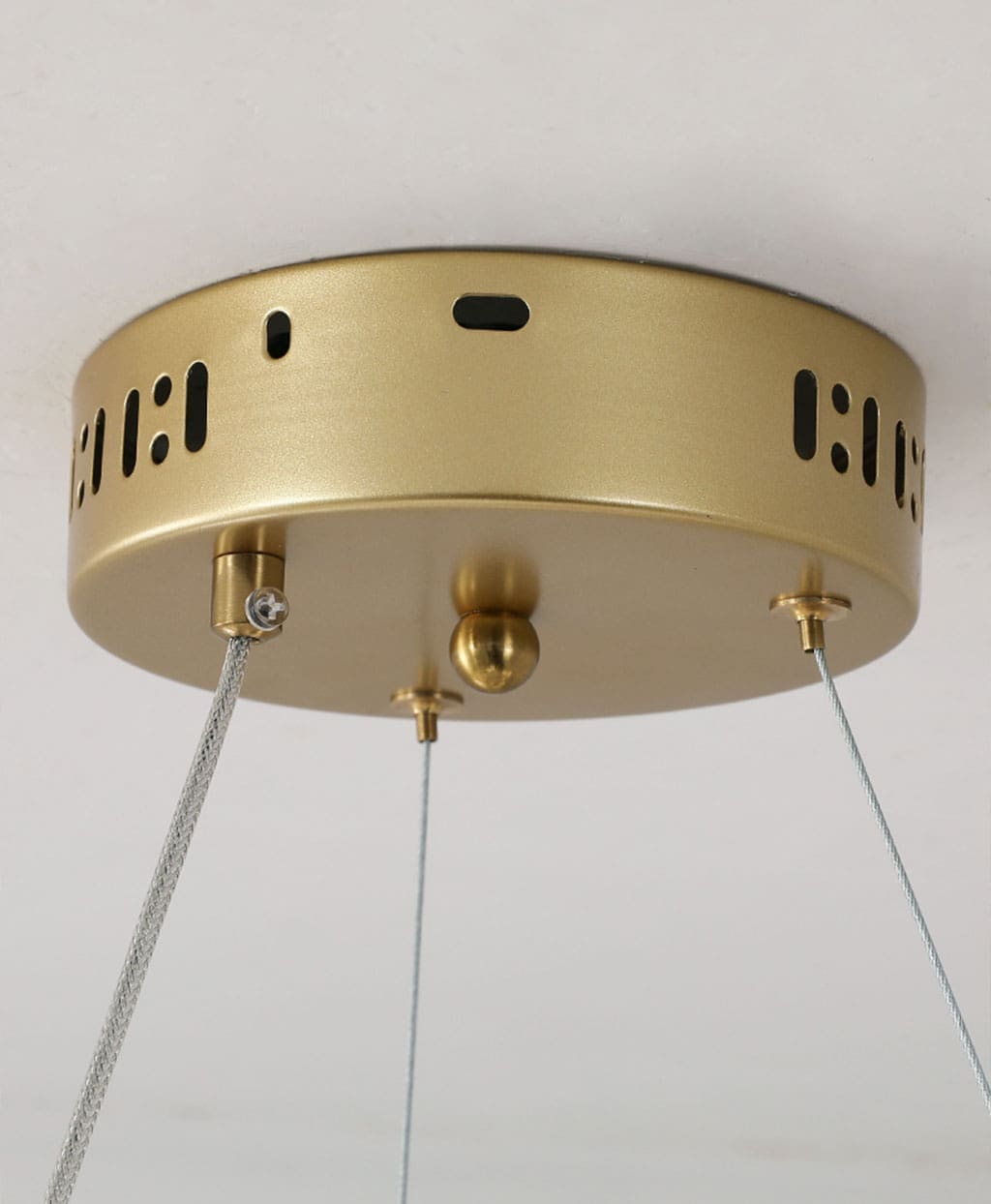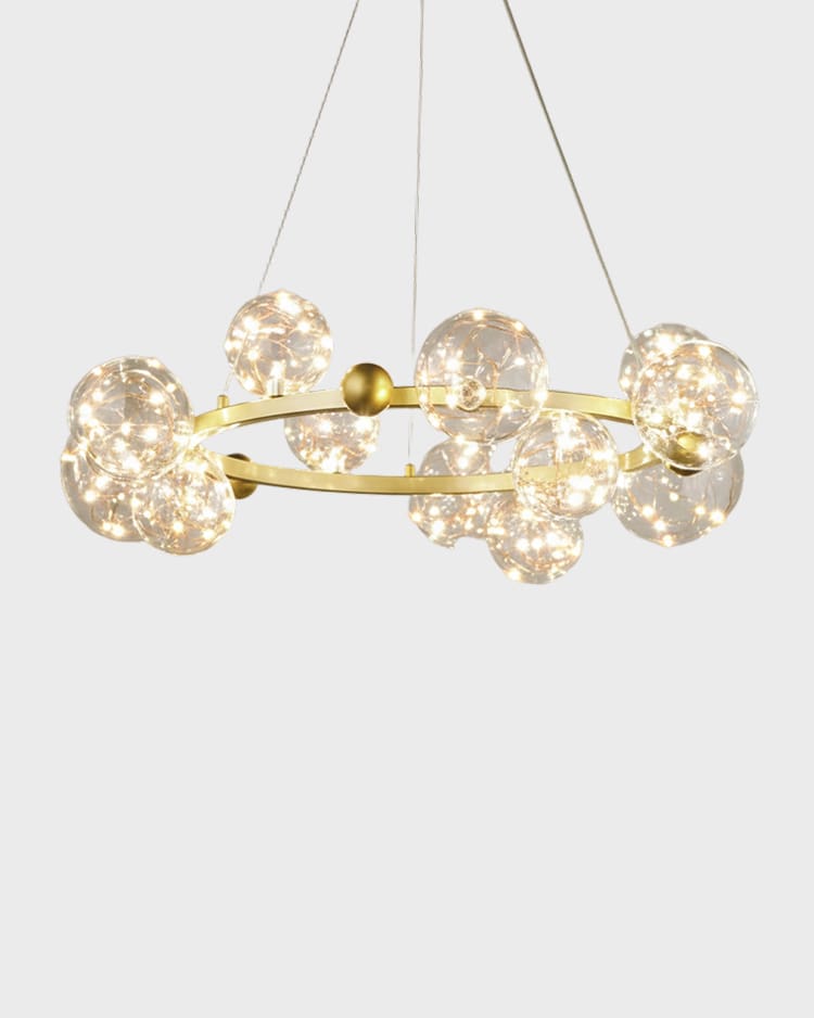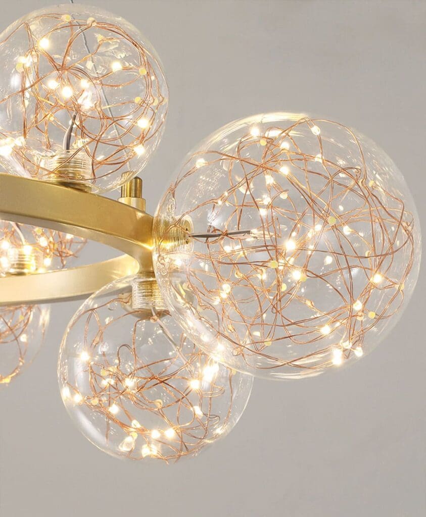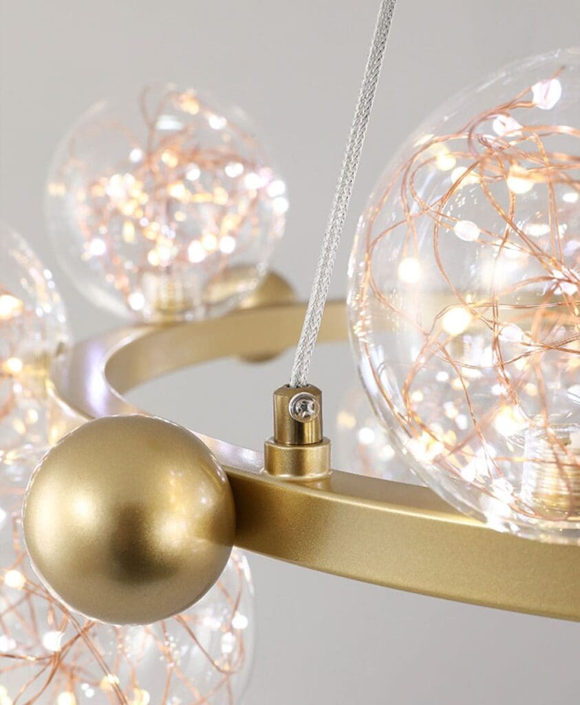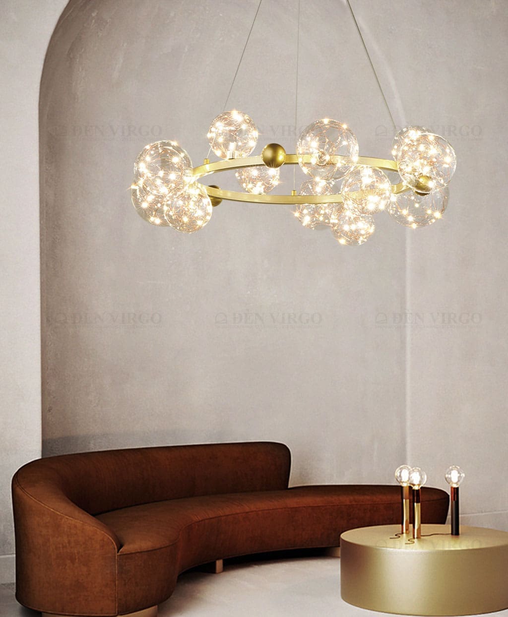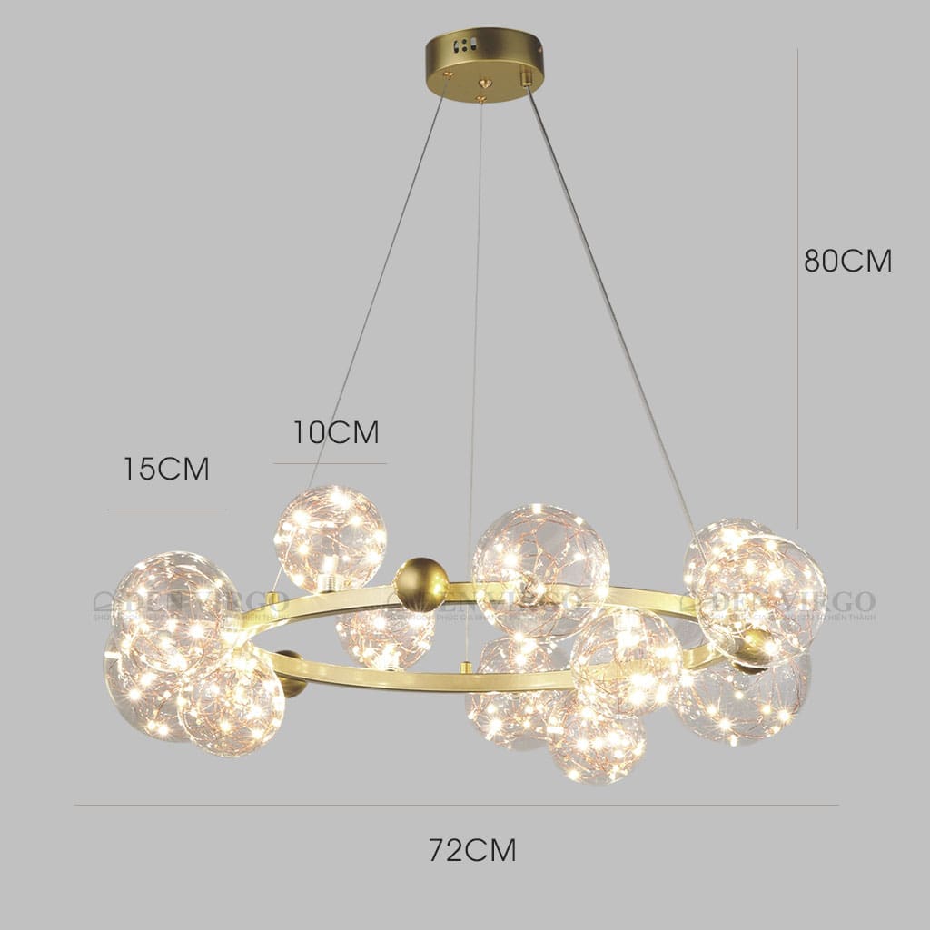 - Thiết Kế Độc Bản: Đèn sử dụng khung vòng tròn mạ vàng/vàng đồng tinh tế. Điểm nhấn là các quả cầu thủy tinh được gắn kết xung quanh, mỗi quả cầu lại chứa các chuỗi đèn LED nhỏ li ti (firefly lights), mô phỏng hình ảnh các vì sao hoặc đom đóm.