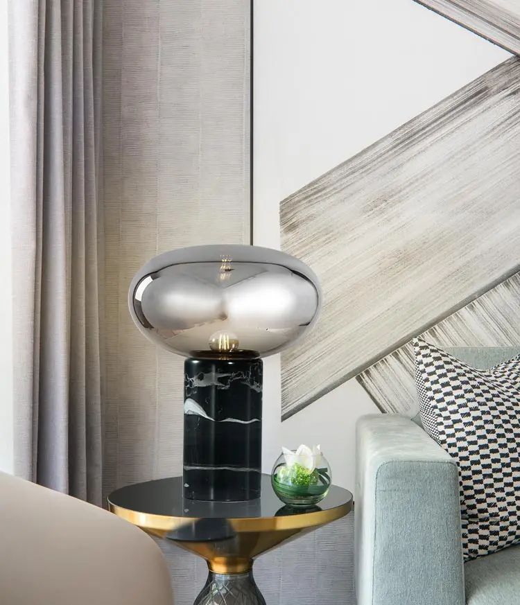 Đây là mẫu đèn bàn trang trí rất thích hợp để trang trí cho phòng khách. Chắc chắn các vị khách của bạn sẽ dành sự ngạc nhiên và hứng thú khi ngắm nhìn chiếc đèn này. Sản phẩm có sự kết hợp mới lạ giữa chao đèn thủy tinh ám khói hình oval và khối đá cẩm thạch hoa văn đen. Thiết kế sang trọng của chiếc đèn cũng góp phần làm nổi bật phòng khách của bạn đấy!