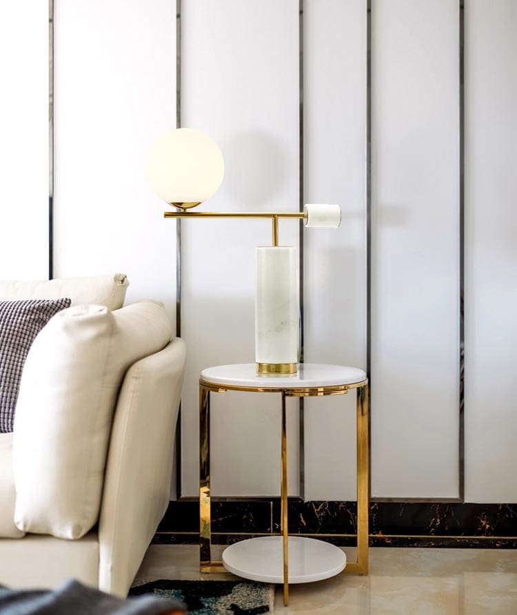 Chiếc đèn để bàn này là một sáng tạo khá mới mẻ của các nhà thiết kế Ý. Thiết kế của sản phẩm là sự dung hòa của các đường nét hình học như hình chóp, đường thẳng, hình trụ và khối cầu. Đồng thời không kém phần tinh tế khi sử dụng các chất liệu cao cấp như đá cẩm thạch trắng, hợp kim xi vàng bóng… Đây là mẫu đèn trang trí rất sang trọng cho phòng khách của bạn.