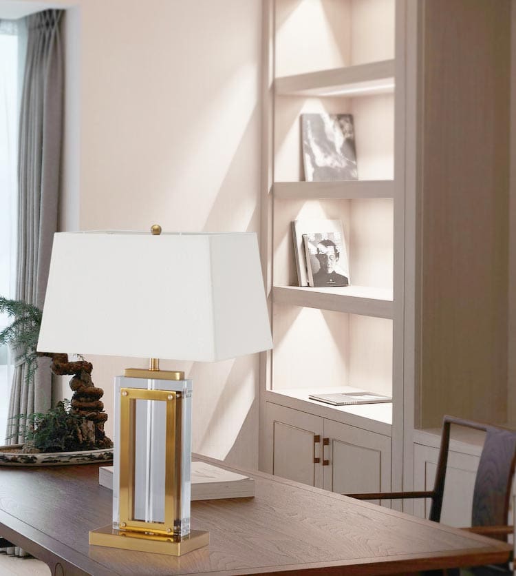 Mẫu đèn bàn này là sự kết hợp của nhiều chi tiết hình học và các đường cắt vuông vắn. Thân đèn thủy tinh hình chữ nhật trong suốt, kết hợp khéo léo các thanh kim loại xi vàng. Sản phẩm vừa có nét rất đơn giản, vừa rất độc đáo để mọi người chiêm ngưỡng và khám phá vẻ đẹp từ nó.