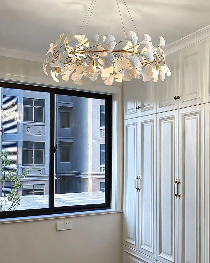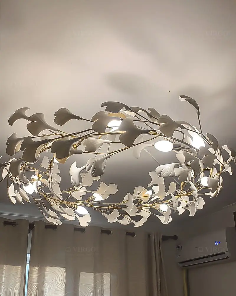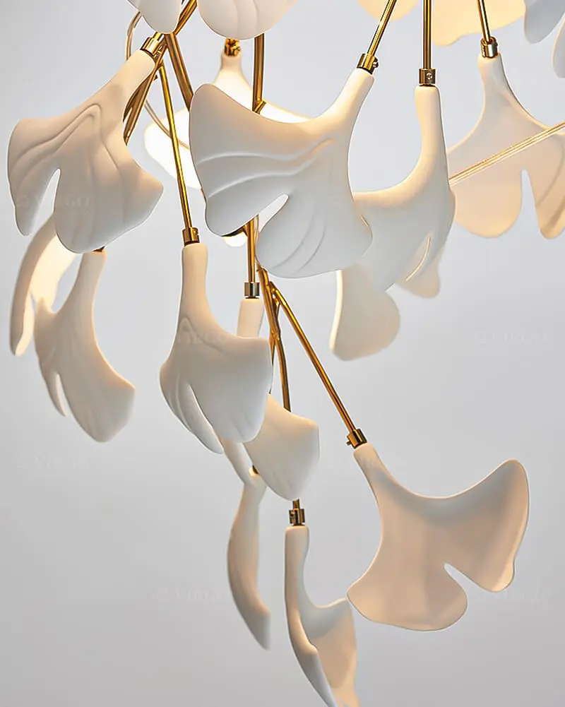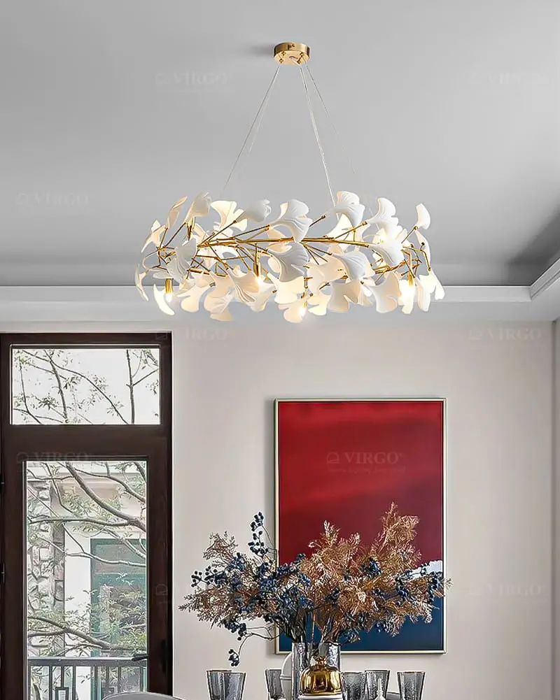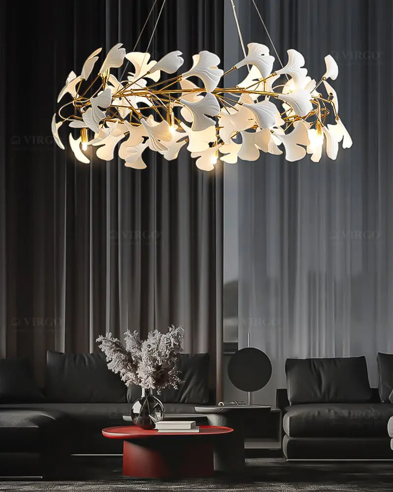 - Thiết Kế Lấy Cảm Hứng Thiên Nhiên: Đèn nổi bật với khung kim loại mạ vàng, từ đó phân nhánh ra các chi tiết lá ngân hạnh được chế tác từ vật liệu cao cấp (gốm, sứ hoặc thủy tinh mờ) màu trắng ngọc. Cấu trúc hình vòng tròn tạo sự cân đối, hài hòa.