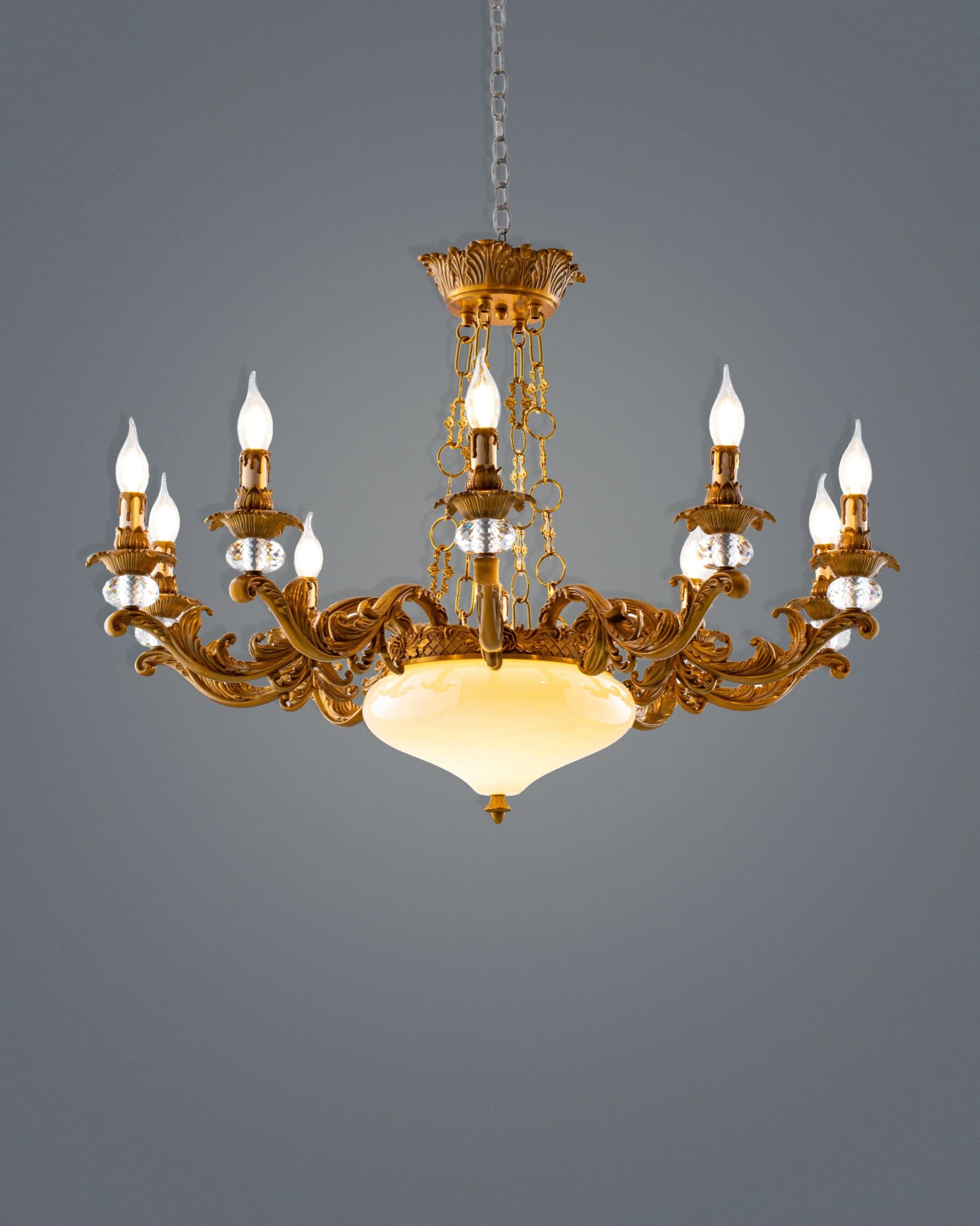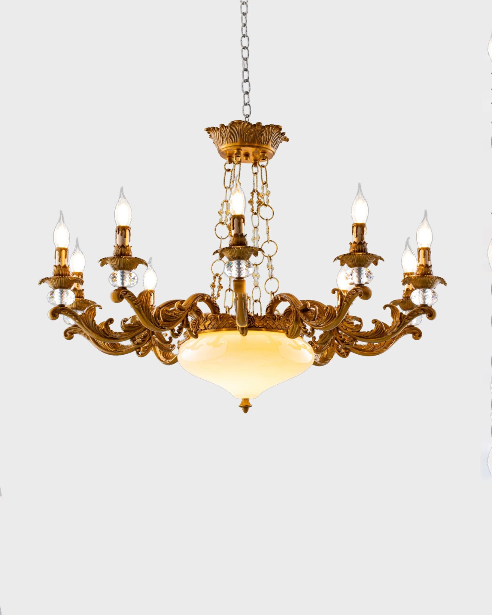 Ngay từ cái nhìn đầu tiên, chiếc đèn chùm tân cổ điển này đã chinh phục người đối diện bằng những đường cong uốn lượn mềm mại trên thân đèn. Mười tay đèn vươn ra kiêu hãnh như mười đóa hoa đang thì nở rộ, tạo nên một kết cấu vừa bề thế, vững chãi, lại vừa bay bổng, thanh thoát. Sự hiện diện của nó ở vị trí trung tâm trần nhà giống như một chiếc vương miện lộng lẫy, tôn vinh vẻ đẹp của toàn bộ không gian phía dưới.