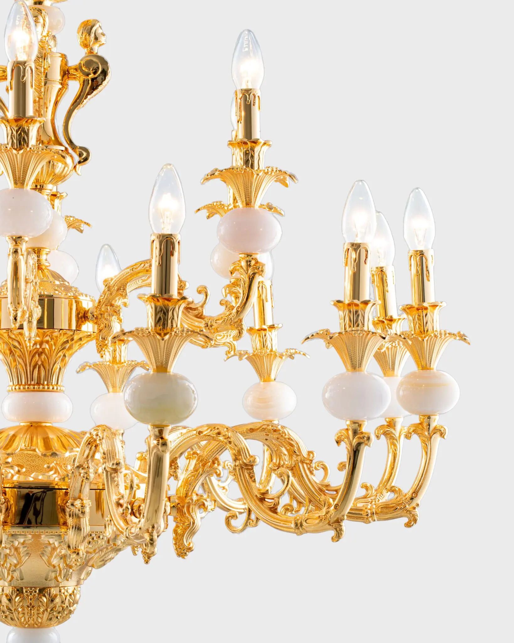 Sở hữu kích thước đồ sộ với 18 tay đèn vươn rộng, mẫu đèn chùm đồng này tái hiện hoàn hảo không gian yến tiệc của giới quý tộc Châu Âu thế kỷ 18. Từng đường nét trên thân đèn không phải là những nét uốn đơn điệu, mà là cả một nghệ thuật điêu khắc. Những họa tiết hoa văn cổ điển được chạm trổ tỉ mỉ trên nền chất liệu đồng dày dặn, tạo nên sự sắc sảo và tinh tế đến từng chi tiết nhỏ. Khi nhìn ngắm chiếc đèn chùm đồng này, người ta không chỉ thấy ánh sáng, mà còn thấy cả tâm huyết và tài hoa của những người nghệ nhân.