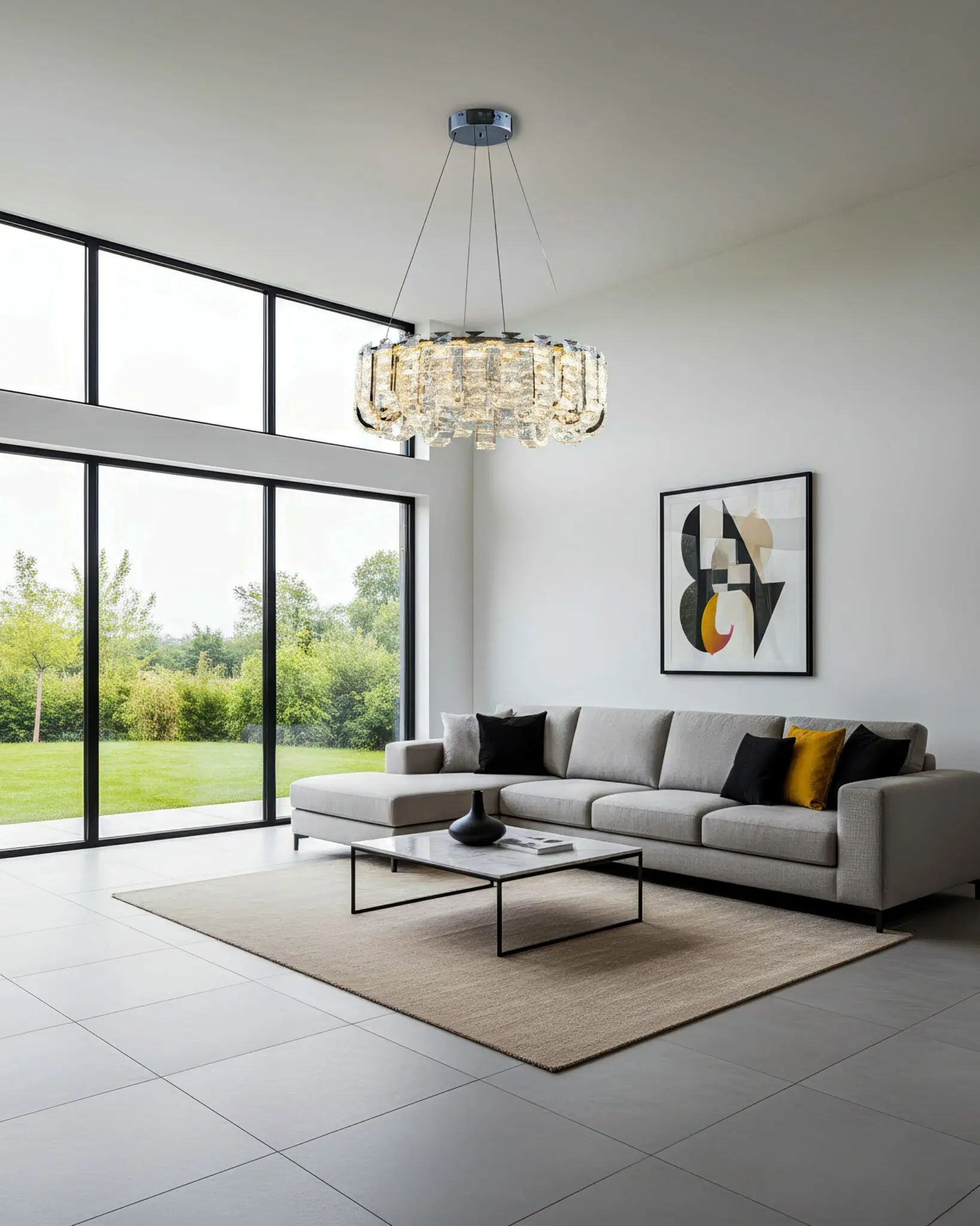Điểm nhấn phòng khách: Trong một không gian hiện đại với sofa và kệ tivi tối giản, vẻ đẹp mềm mại của đèn thả pha lê sẽ giúp cân bằng lại các đường nét, mang lại sự sang trọng (Modern Luxury) mà không hề phô trương.