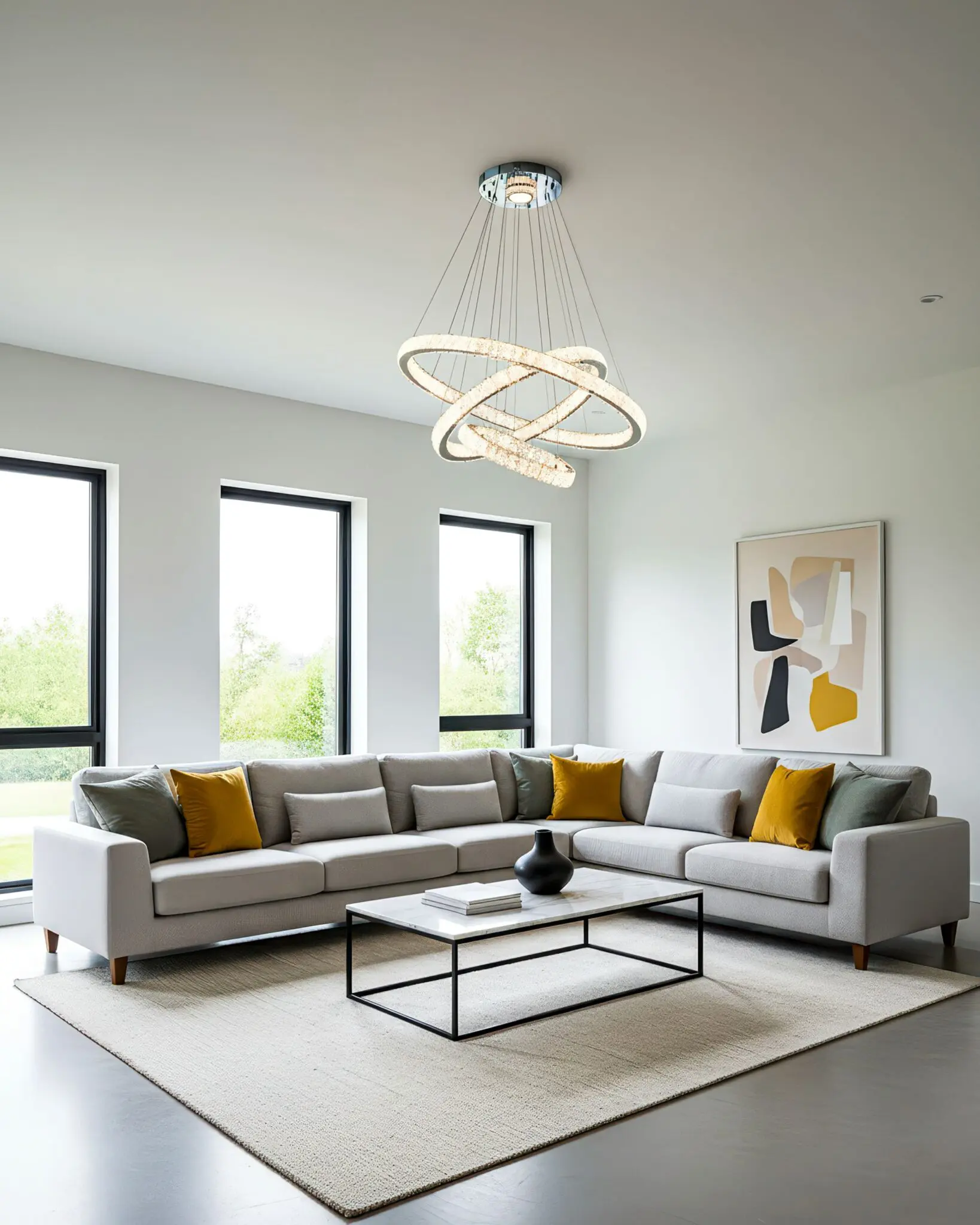 Phòng khách biệt thự: Treo mẫu đèn chùm pha lê này ở vị trí trung tâm sẽ giúp cân bằng tỉ lệ không gian, xóa tan cảm giác trống trải của trần nhà cao. Nó trở thành tâm điểm thị giác (Focal Point), thu hút mọi ánh nhìn và khẳng định vị thế của gia chủ.