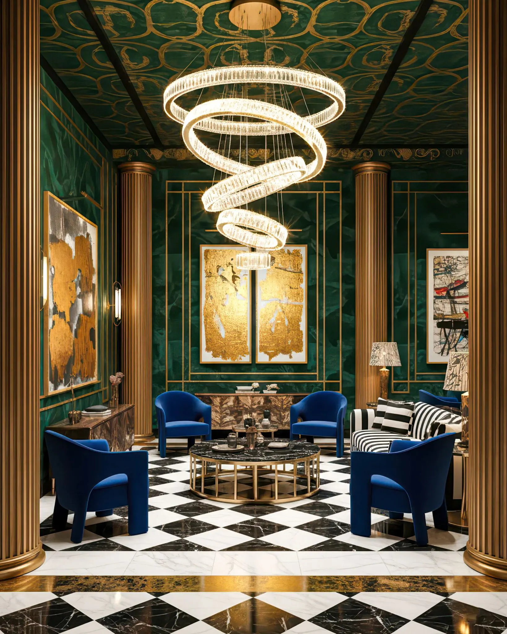 Các chi tiết pha lê/thủy tinh nghệ thuật trên mẫu đèn thả thông tầng này được sắp xếp so le, tầng tầng lớp lớp tạo nên chiều sâu hút mắt. Khi ngước nhìn từ dưới lên, bạn sẽ bị choáng ngợp bởi sự lộng lẫy và quy mô hoành tráng mà chiếc đèn thả thông tầng này mang lại. Nó là minh chứng rõ nét nhất cho gu thẩm mỹ xa hoa và vị thế thượng lưu của gia chủ.