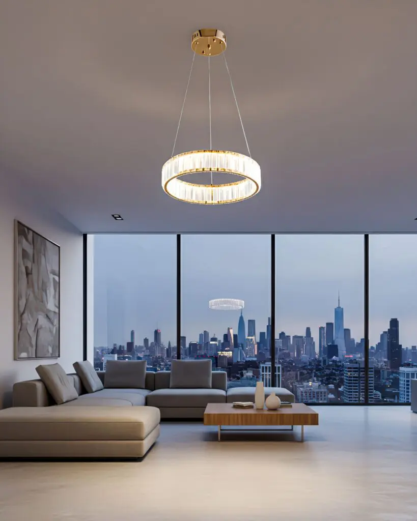 Tại phòng khách: Một chiếc đèn thả pha lê được treo ở vị trí trung tâm sẽ trở thành điểm nhấn thị giác (Focal Point) đầy ấn tượng. Nó phá vỡ sự đơn điệu của trần nhà, mang lại sự sang trọng và ấm cúng. Ánh sáng lung linh từ đèn sẽ làm nổi bật các món đồ nội thất xung quanh như bộ sofa da hay bàn trà mặt đá.