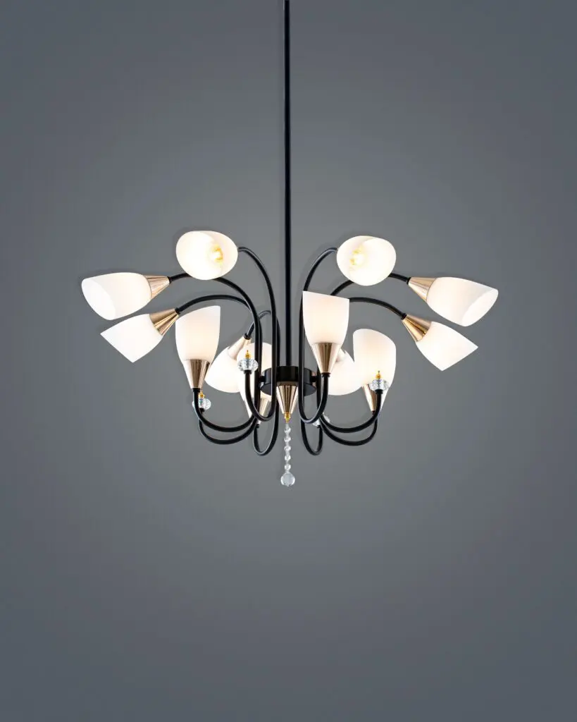 Với thiết kế 12 tay đèn được sắp xếp đối xứng, mẫu đèn chùm tân cổ điển này gợi nhớ đến những sảnh tiệc lộng lẫy trong các cung điện Châu Âu xưa. Từng tay đèn vươn lên mạnh mẽ như những đóa hoa đang nở rộ, nâng đỡ nguồn sáng rực rỡ. Khi treo ở vị trí trung tâm phòng khách, chiếc đèn chùm tân cổ điển này ngay lập tức trở thành tâm điểm thị giác (Focal Point), thu hút mọi ánh nhìn ngưỡng mộ bởi vẻ đẹp vừa uy nghi, vừa thanh thoát.