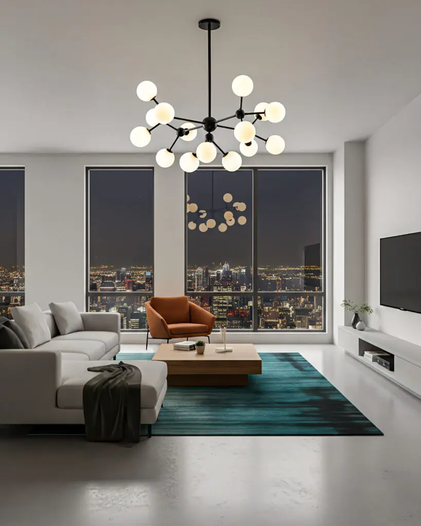 Lớp áo đen huyền bí: Công nghệ sơn tĩnh điện màu đen nhám (Matte Black) mang lại vẻ đẹp hiện đại, lạnh lùng và đầy cá tính. Màu đen cũng là gam màu dễ phối nhất, giúp chiếc đèn chùm phân tử nổi bật hoàn toàn trên nền trần thạch cao trắng.