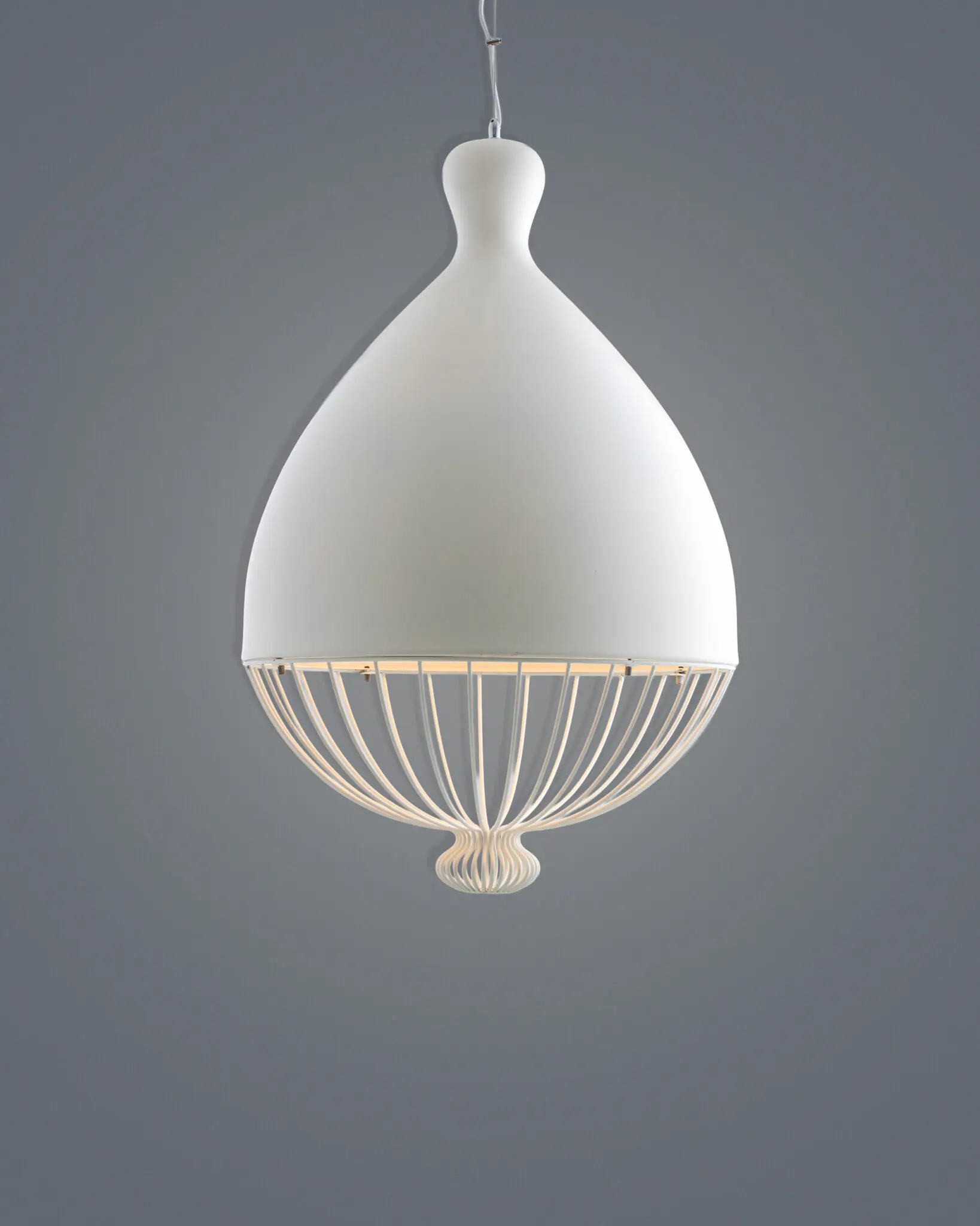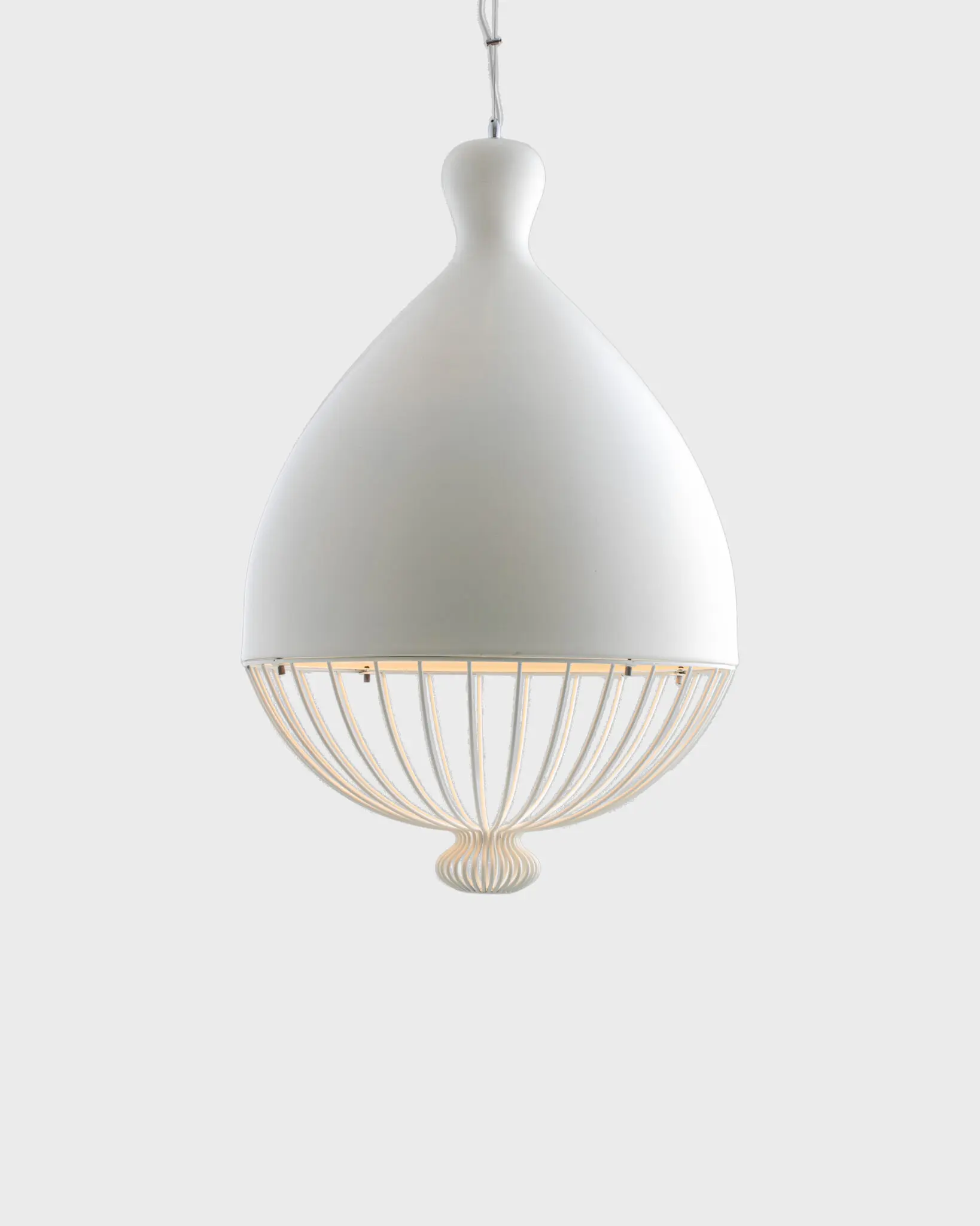 Sắc trắng Matte White: Khác với màu trắng bóng (Glossy) thông thường, lớp sơn màu trắng mờ (Matte) mang lại cảm giác lì, mịn và có chiều sâu. Màu trắng giúp chiếc đèn thả trần này dễ dàng hòa nhập vào mọi tông màu nội thất, từ tường xám, gỗ sồi cho đến những gam màu pastel ngọt ngào.