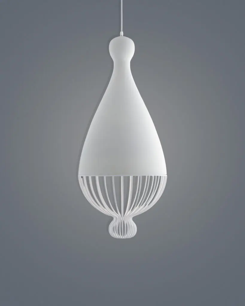 Phiên bản thon gọn và thanh thoát của dòng đèn thả giọt nước đình đám. Mẫu đèn thả trần VRG-9132S sở hữu dáng vẻ mảnh mai như một chiếc bình gốm nghệ thuật treo lơ lửng. Vẫn giữ nguyên thiết kế bầu đèn sơn trắng mờ (Matte White) kết hợp đáy lồng thoáng khí, nhưng với chiều cao vượt trội hơn, chiếc đèn giúp ‘kéo dài’ không gian thị giác, tạo cảm giác trần nhà cao và thoáng hơn.