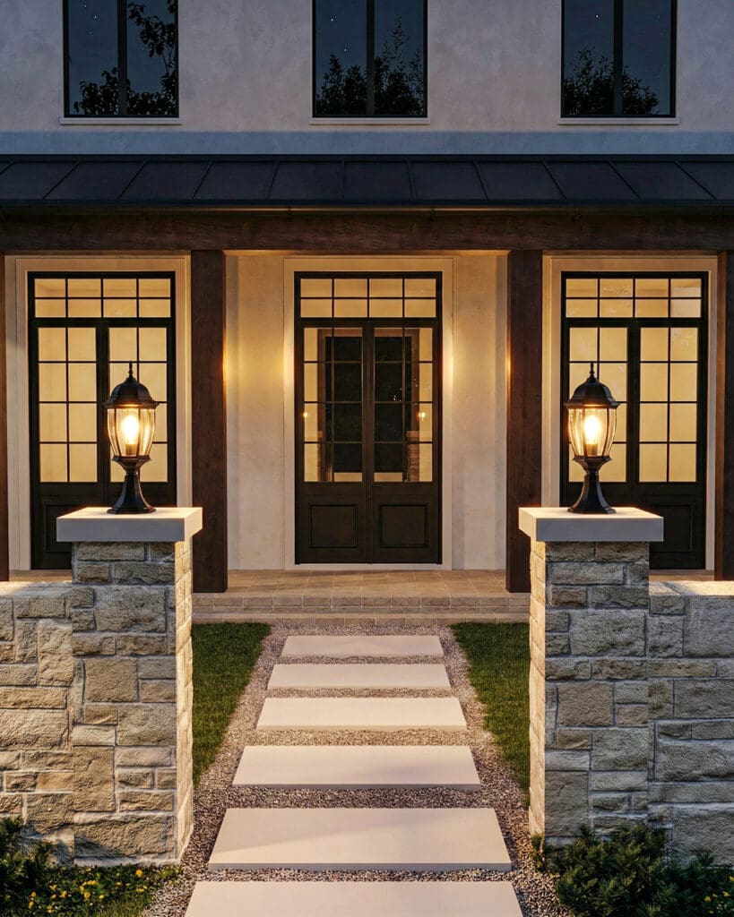 Đèn trụ lối đi sân vườn: Sử dụng đèn trụ cổng VRG-059 đặt trên các bệ thấp dọc lối đi dạo hoặc bậc tam cấp, vừa trang trí vừa đảm bảo an toàn khi di chuyển.