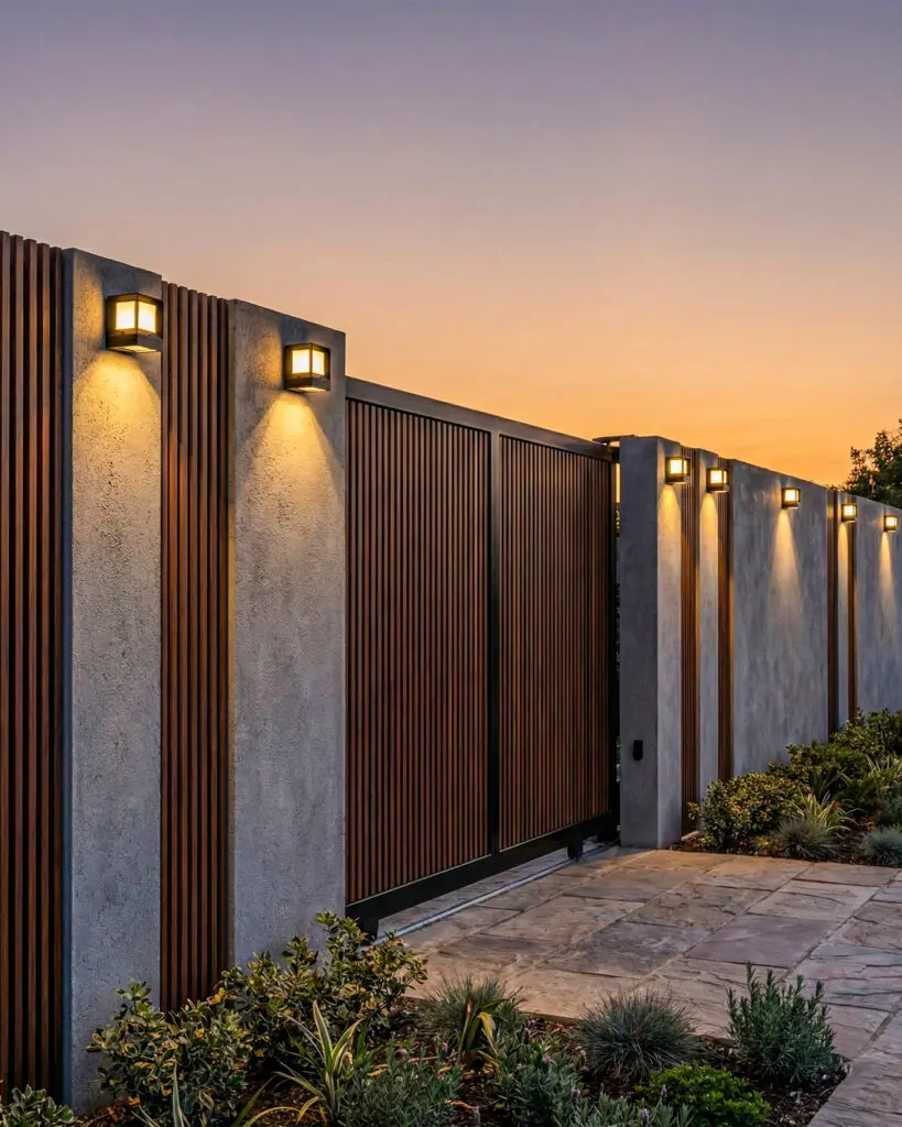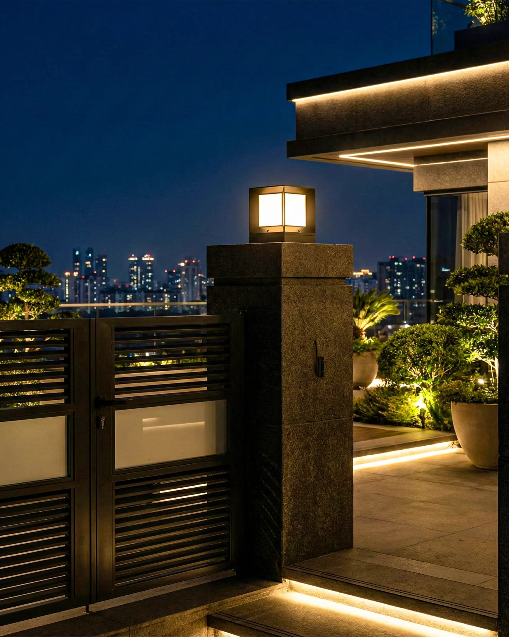 Đèn trụ cổng cho tường rào: Lắp đặt dọc theo hệ thống tường bao quanh nhà để tạo sự đồng bộ và mở rộng không gian ánh sáng cho sân vườn.