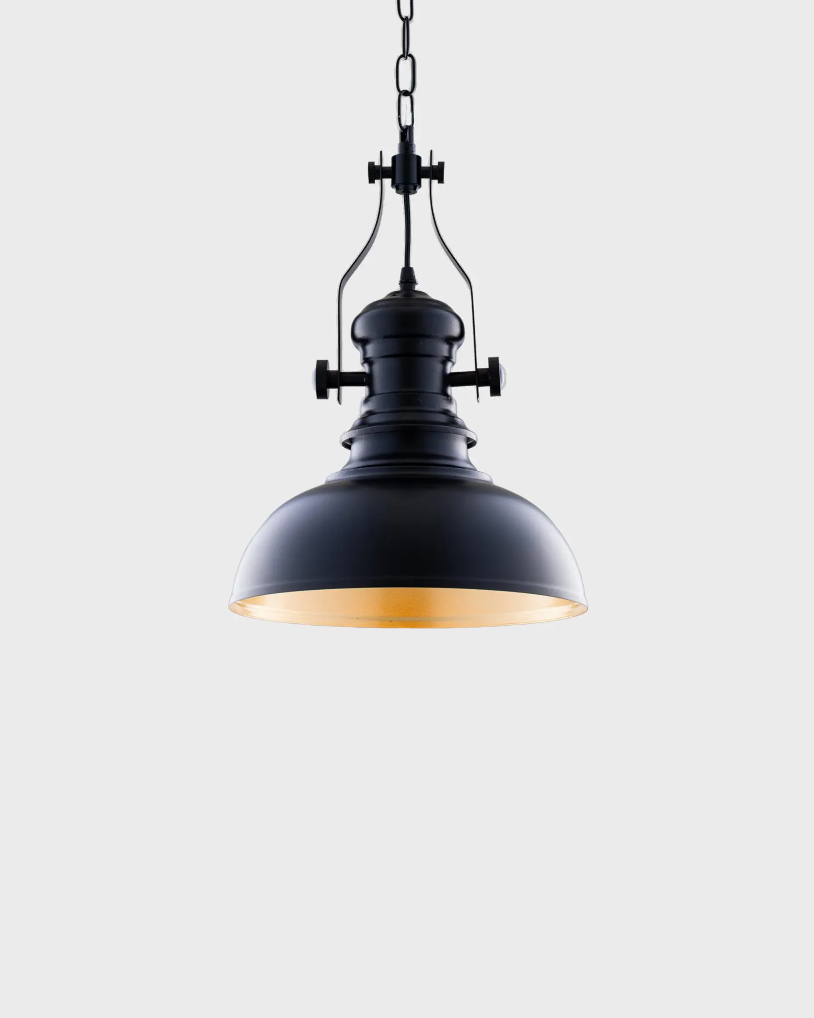 Màu sắc trung tính: Lớp vỏ bên ngoài thường được phủ sơn tĩnh điện màu Đen nhám (Matte Black) hoặc Trắng (White). Đây là những gam màu mạnh mẽ, giúp chiếc đèn thả chao nổi bật trên nền trần bê tông thô mộc hay trần thạch cao trắng, tạo nên sự tương phản thị giác thú vị.