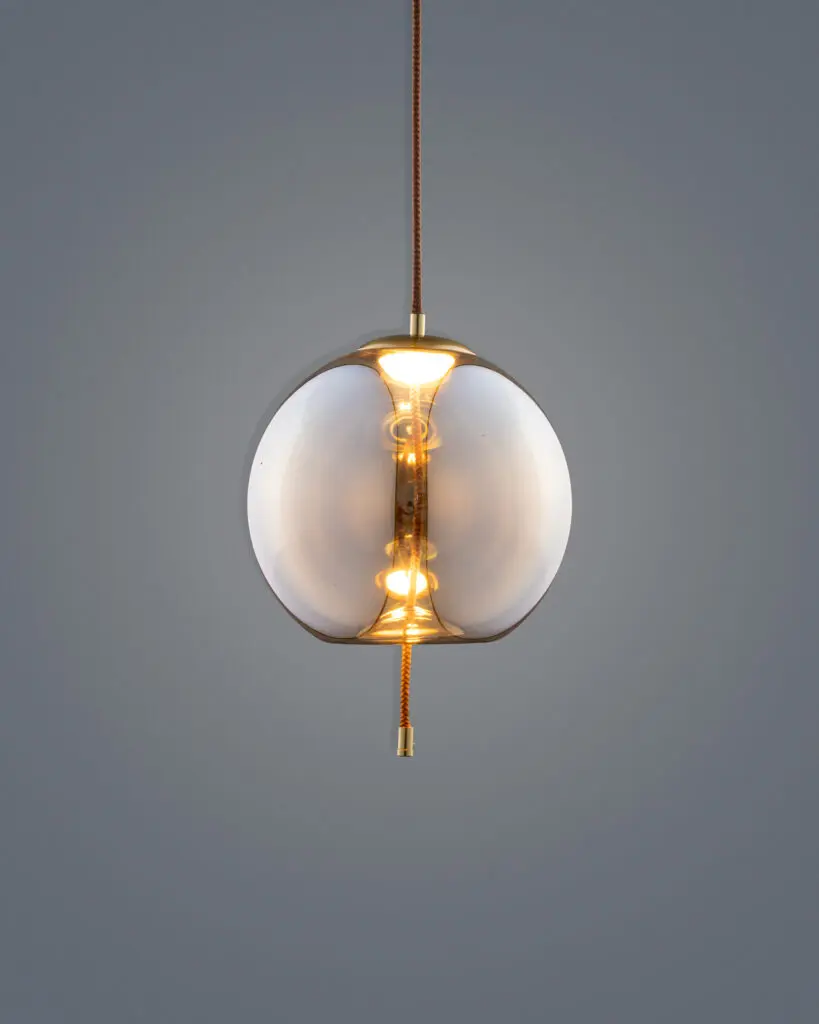 Chất liệu thủy tinh nghệ thuật: Lớp vỏ thủy tinh cao cấp (thường là màu trà hoặc khói) có độ trong trẻo tuyệt đối. Khi treo lên, chiếc đèn thả thủy tinh trông như một giọt mật ong khổng lồ lơ lửng giữa không trung, tạo nên vẻ đẹp vừa hiện đại vừa phảng phất nét hoài cổ (Vintage).