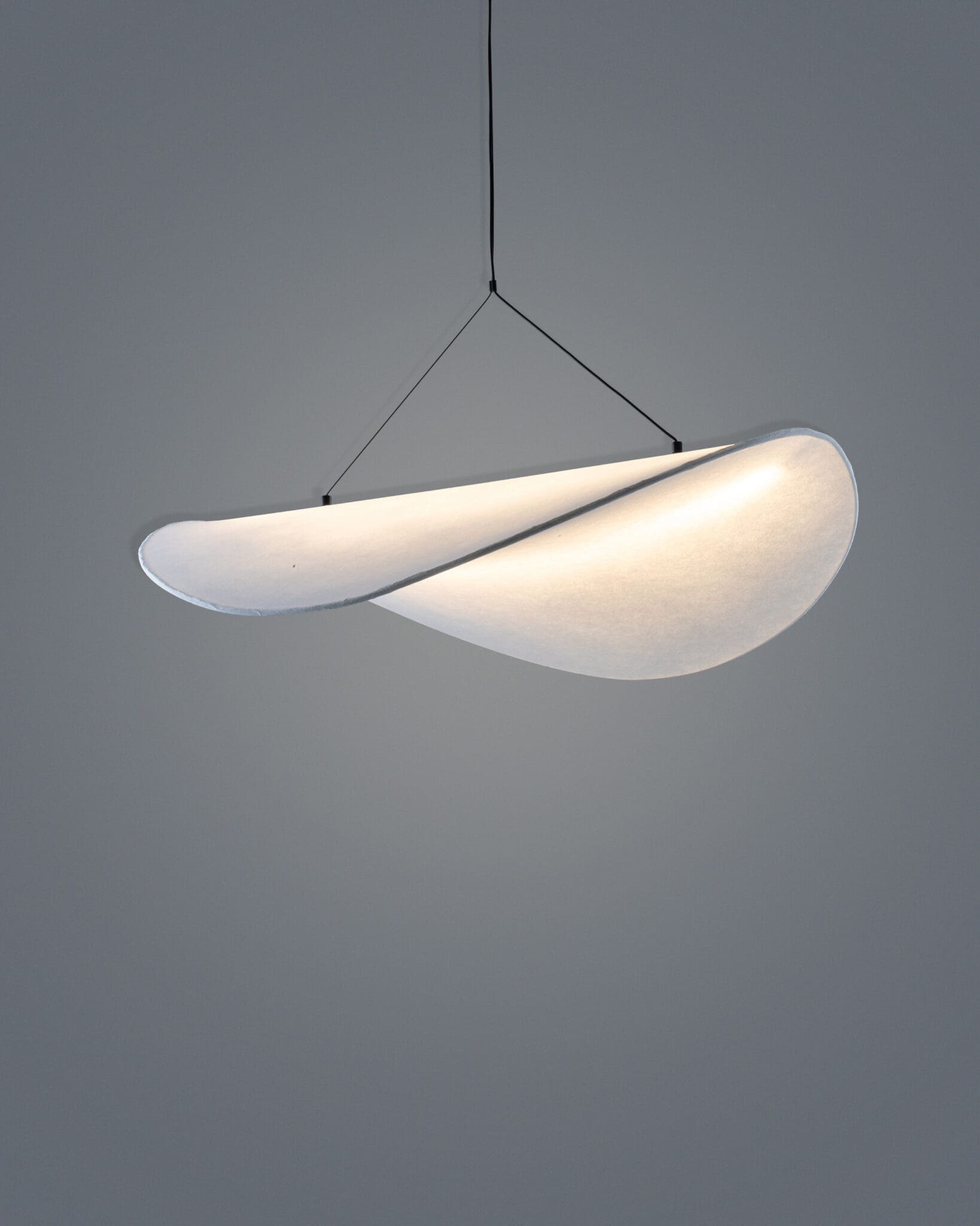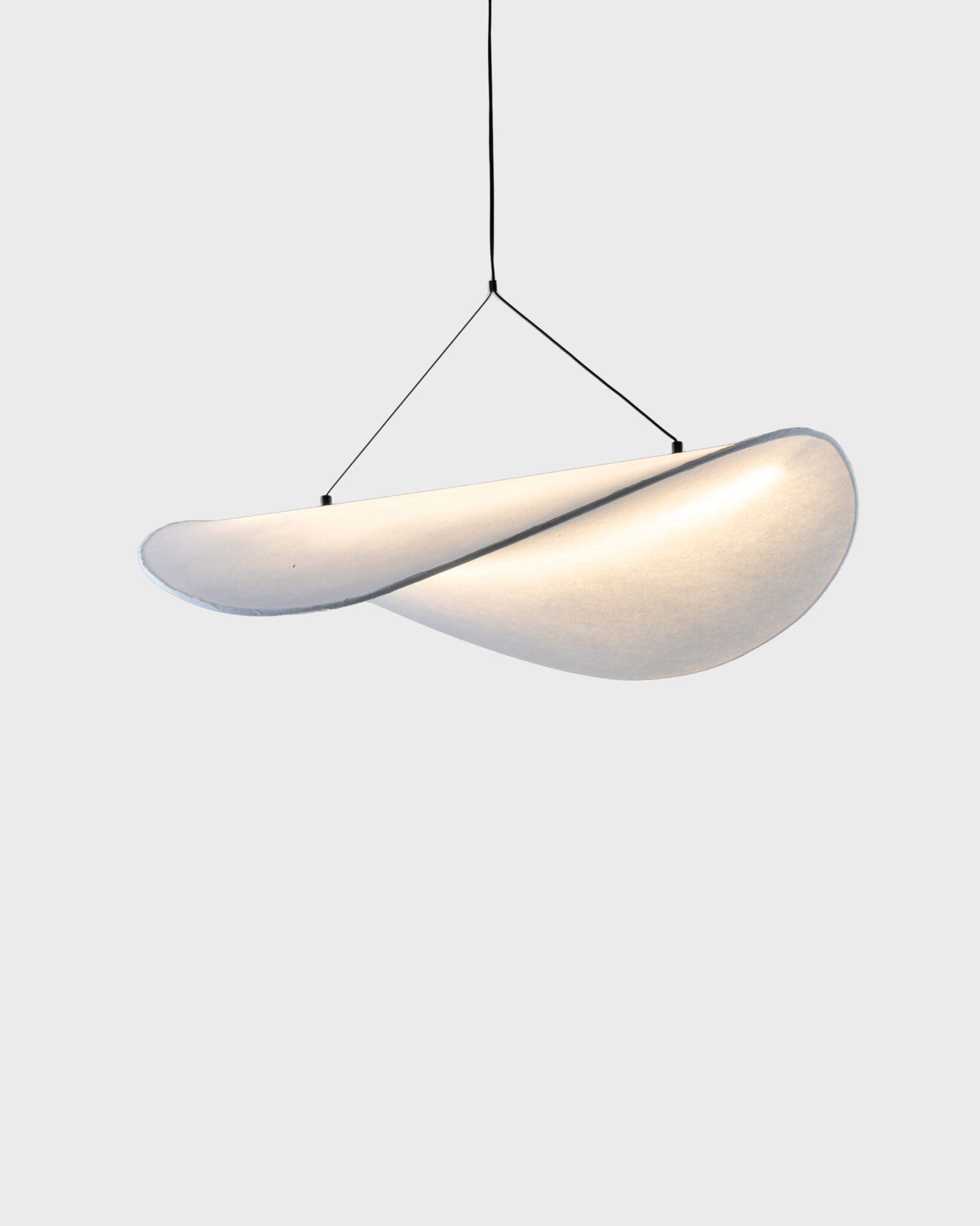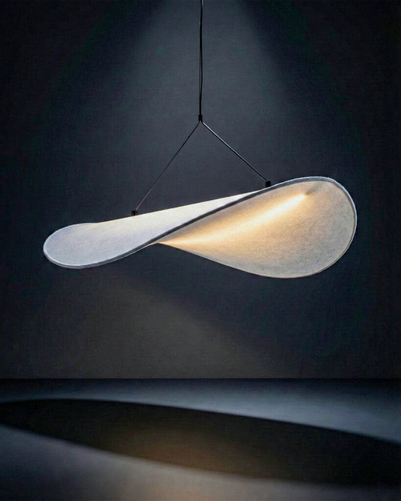 Dáng “Mũ Bay” độc bản: Thân đèn được uốn lượn tự do, trông như một chiếc mũ rộng vành hay một dải lụa đang bay nhẹ trong gió. Sự bất đối xứng có chủ đích này tạo nên nét duyên dáng, phá vỡ sự nhàm chán của trần nhà phẳng lì.