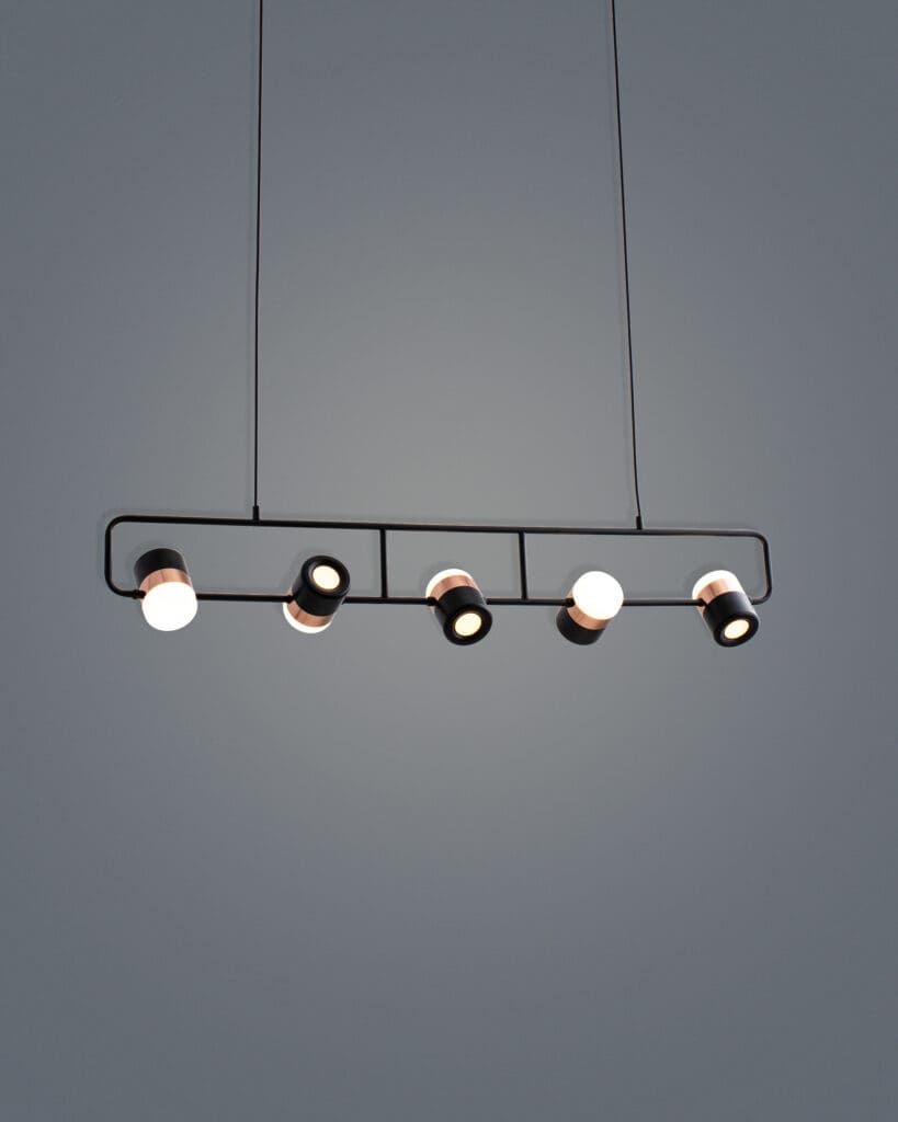 Cấu trúc Linear (Thanh ngang): 5 chao đèn được sắp xếp thẳng hàng trên một trục ngang hoặc phân bổ nghệ thuật trên mâm ốp trần. Thiết kế này tạo ra sự tương đồng về hình khối với những chiếc bàn ăn hình chữ nhật hoặc oval dài. Khi treo chiếc đèn thả bàn ăn này song song với mặt bàn, nó tạo nên sự cân đối hoàn hảo, giúp không gian trở nên hài hòa và có chiều sâu.