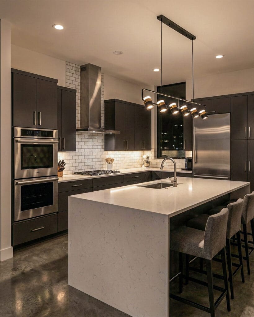Đèn thả đảo bếp lớn: Biến khu vực đảo bếp thành một quầy bar sang trọng, nơi gia đình có thể quây quần thưởng thức bữa sáng hoặc những ly cocktail.