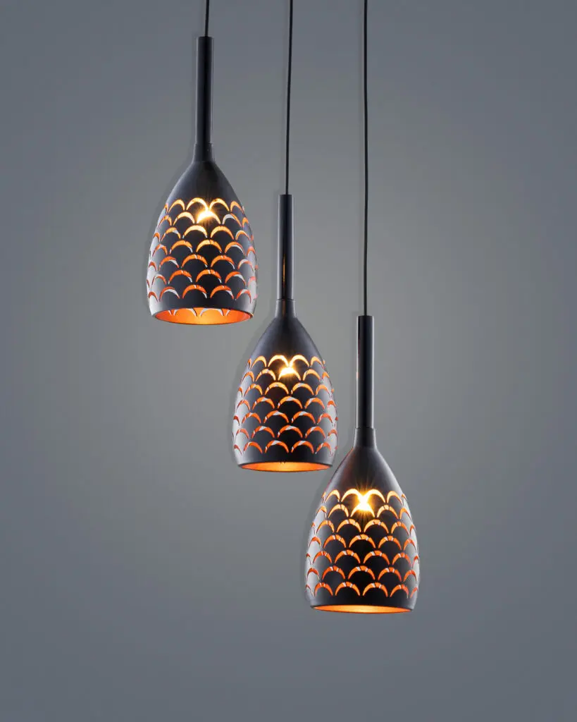 Bộ 3 Đèn Thả Bàn Ăn Vỏ Đen Lòng Vàng Họa Tiết Vảy Cá VRG-TKLE3176-3 là sản phẩm có thiết kế với bóng LED chất lượng cao, đảm bảo khả năng sử dụng lâu bền với tuổi thọ tối đa đến 40.000 giờ. Ánh sáng ấm cúng, dễ chịu và bảo vệ cho mắt nhìn.