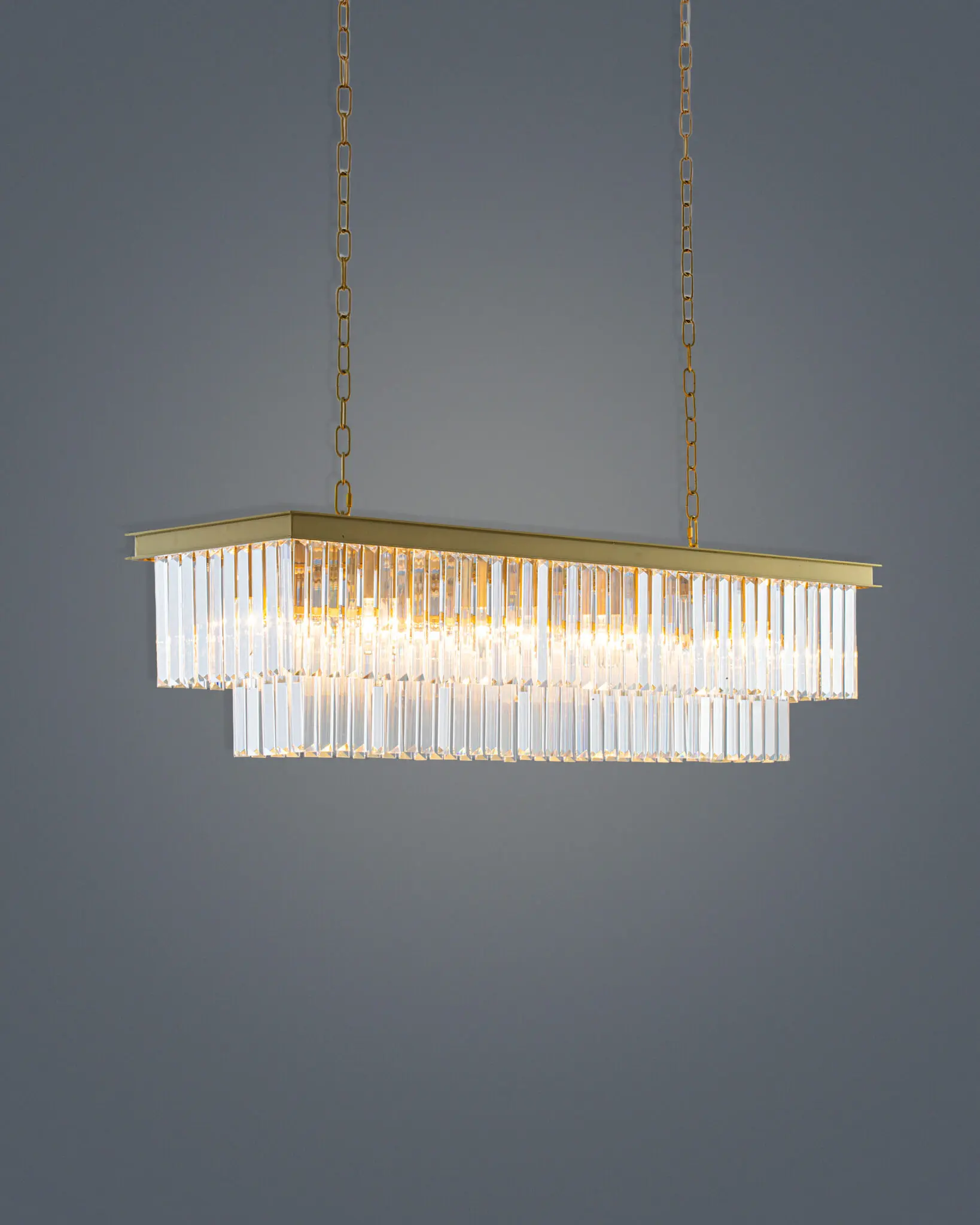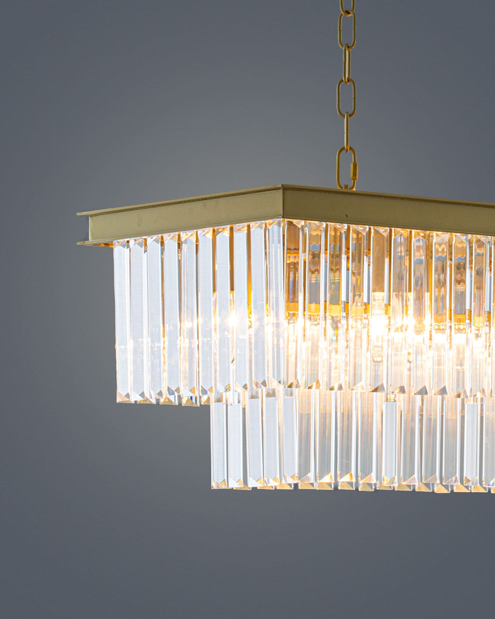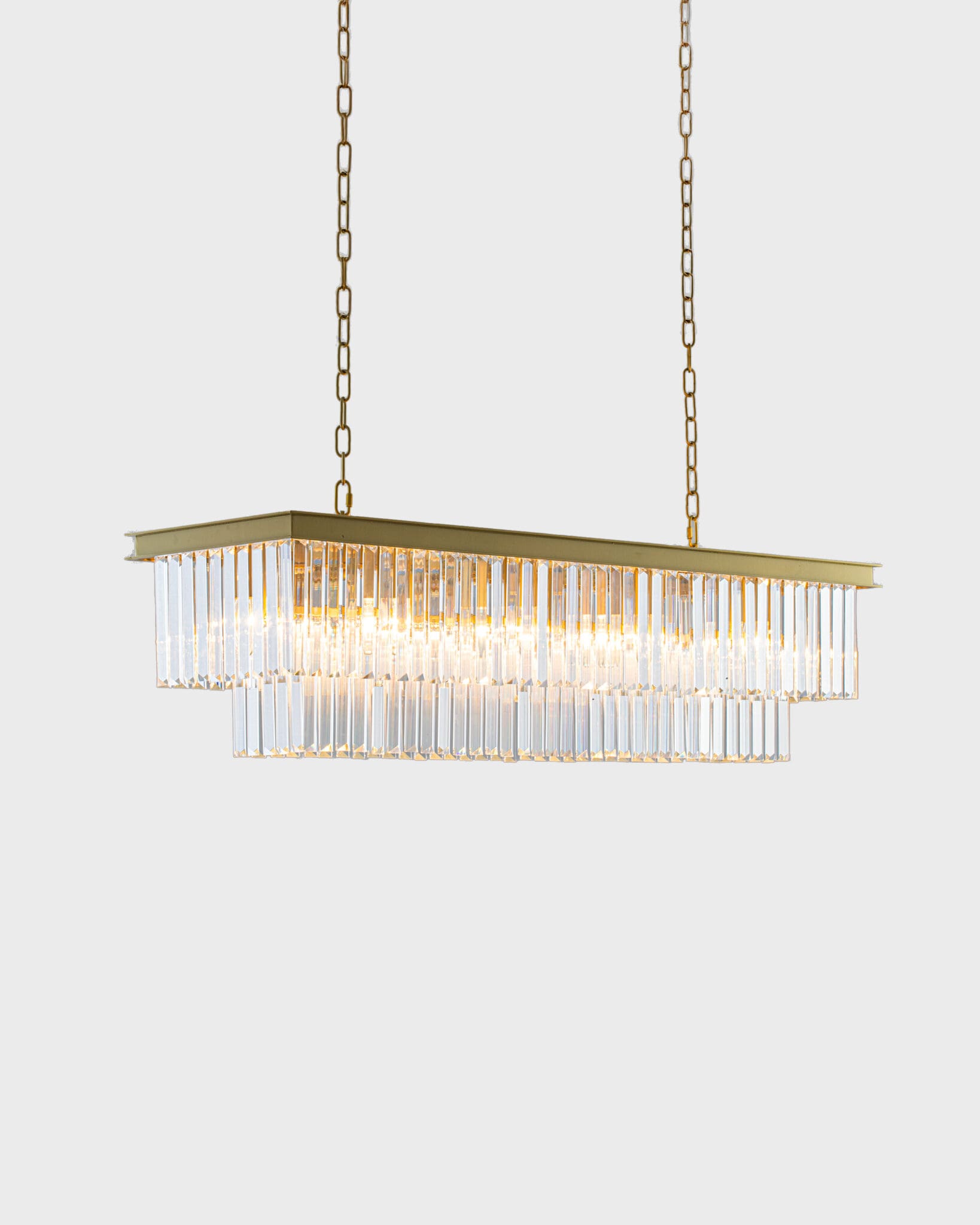 Khác với đèn chùm tròn truyền thống, đèn thả pha lê VRG-TH808621 sở hữu cấu trúc Linear (thanh ngang) thời thượng.