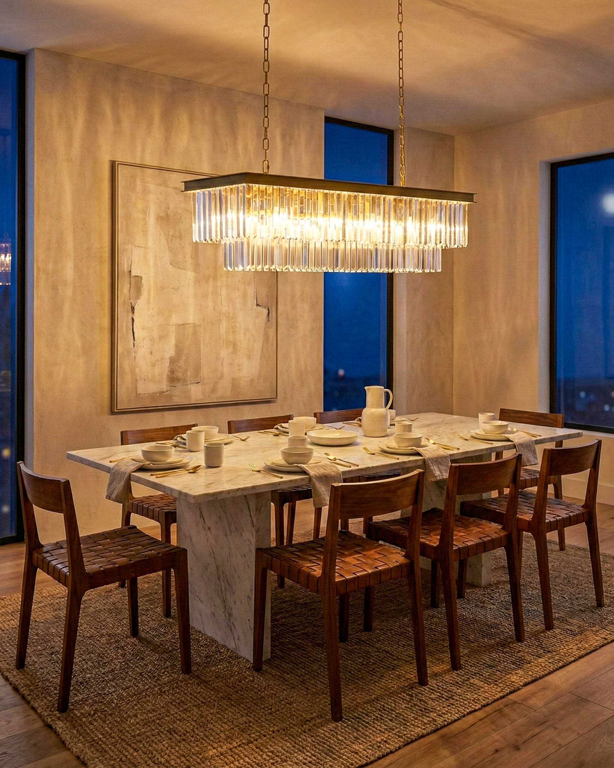 Đèn thả pha lê bàn ăn: Phù hợp nhất với các loại bàn ăn hình chữ nhật dài (từ 6-10 ghế). Chiều dài của đèn nên chiếm khoảng 1/2 đến 2/3 chiều dài mặt bàn để đạt tỷ lệ thẩm mỹ tốt nhất.