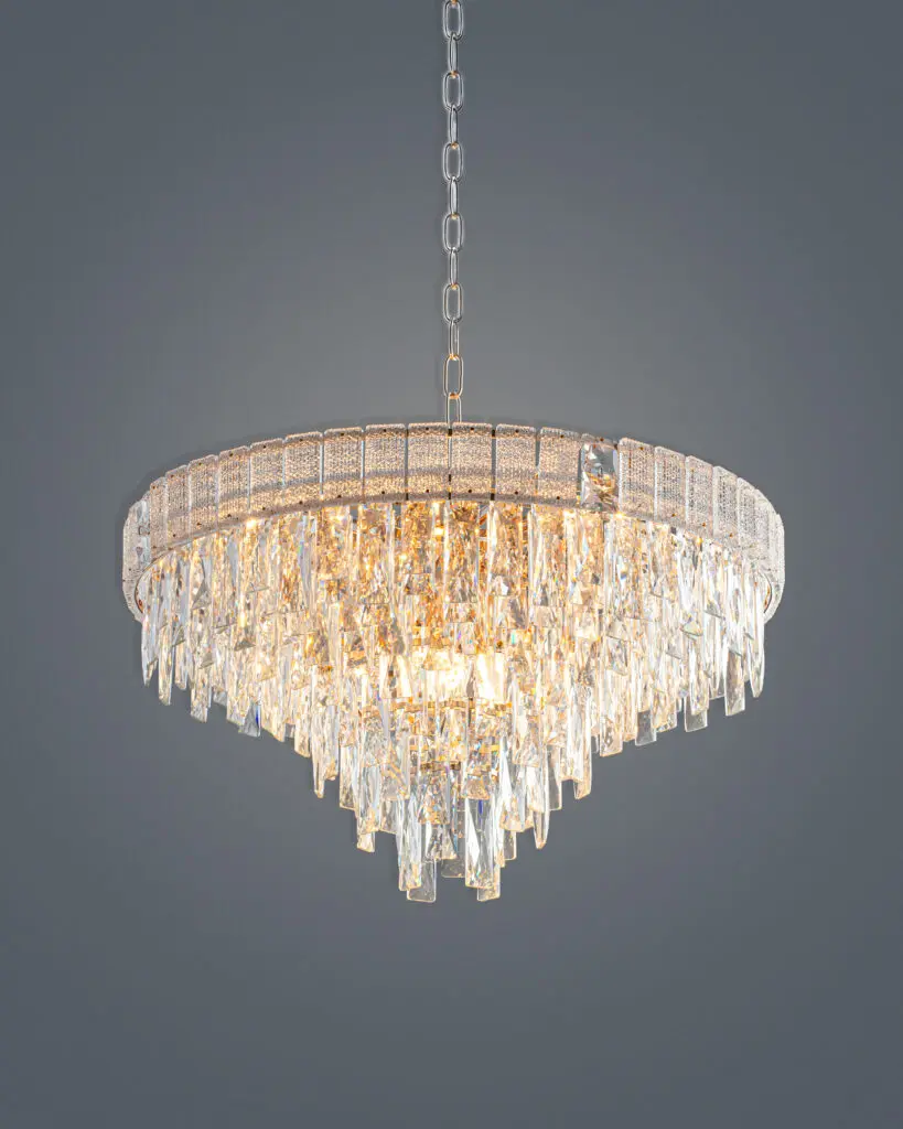 Điểm nhấn đắt giá nhất của sản phẩm chính là cấu trúc xếp tầng hình tháp ngược. Các thanh pha lê được sắp xếp khéo léo thành nhiều lớp, lớp ngoài cùng lớn nhất và thu nhỏ dần về phía dưới cùng. Cách sắp xếp này tạo nên hiệu ứng thị giác về chiều sâu 3D tuyệt vời. Khi nhìn từ dưới lên, chiếc đèn như một bông hoa tuyết khổng lồ đang tỏa sáng. Khi nhìn ngang, nó lại giống như một thác nước pha lê đang tuôn chảy từ trần nhà, mang lại cảm giác về sự luân chuyển và năng lượng dồi dào.