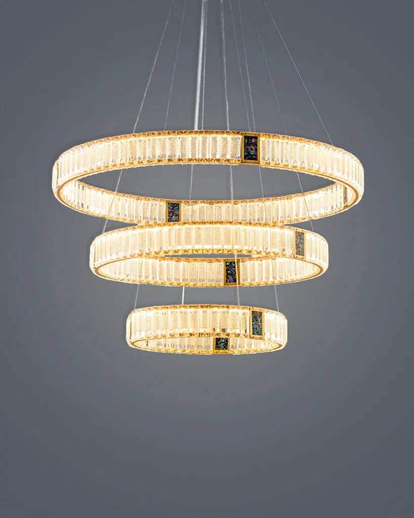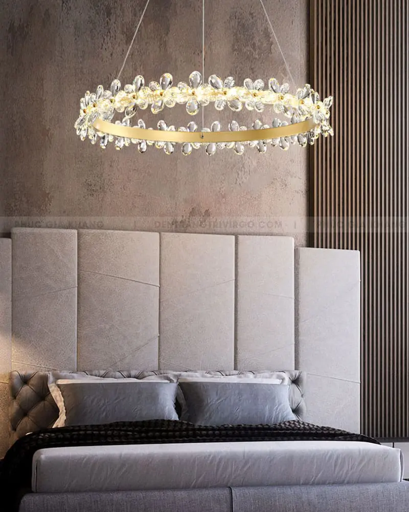 Tầng 3 (Vòng nhỏ nhất): Là điểm tụ của ánh sáng, tạo chiều sâu hun hút. Khoảng cách giữa các tầng được các nhà thiết kế tính toán tỉ lệ vàng, tạo nên sự cân đối hoàn hảo. Khi treo chiếc đèn chùm pha lê phòng khách này lên, nó ngay lập tức lấp đầy khoảng trống của trần nhà, xóa tan cảm giác lạnh lẽo của những căn phòng quá rộng.