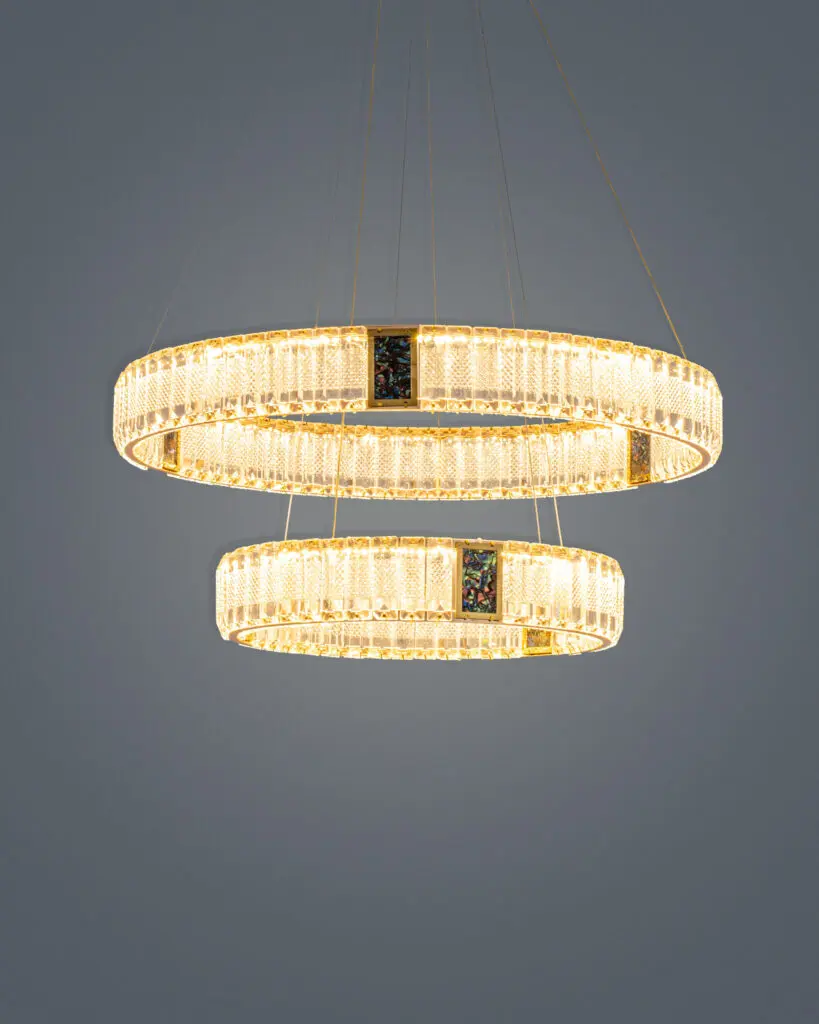 Đèn được cấu tạo từ hai vòng tròn pha lê với kích thước khác nhau: vòng lớn ở trên và vòng nhỏ ở dưới, được treo thả song song bằng hệ thống dây cáp mảnh mai nhưng chắc chắn. Cấu trúc “tháp ngược” này giúp chiếc đèn trông gọn gàng, thanh thoát nhưng vẫn giữ được sự lộng lẫy cần thiết. Khi treo ở trung tâm phòng khách, nó giống như một chiếc vương miện ánh sáng lơ lửng giữa không trung, tỏa ra khí chất vương giả cho cả căn phòng.