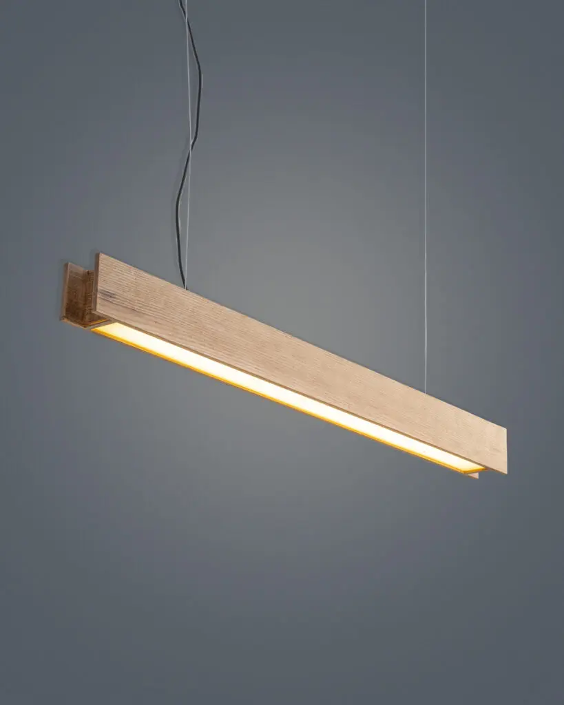 Đèn có hình dáng là một thanh gỗ dài hình hộp chữ nhật, sắc sảo và gãy gọn trong từng đường nét. Thiết kế linear (dạng tuyến) này tạo cảm giác không gian được mở rộng theo chiều ngang, giúp căn phòng trông thoáng đãng và ngăn nắp hơn. Sự đơn giản trong hình khối giúp chiếc đèn thả thanh gỗ này không bao giờ bị lỗi thời, nó đứng ngoài mọi quy luật của những trào lưu “sớm nở tối tàn”.