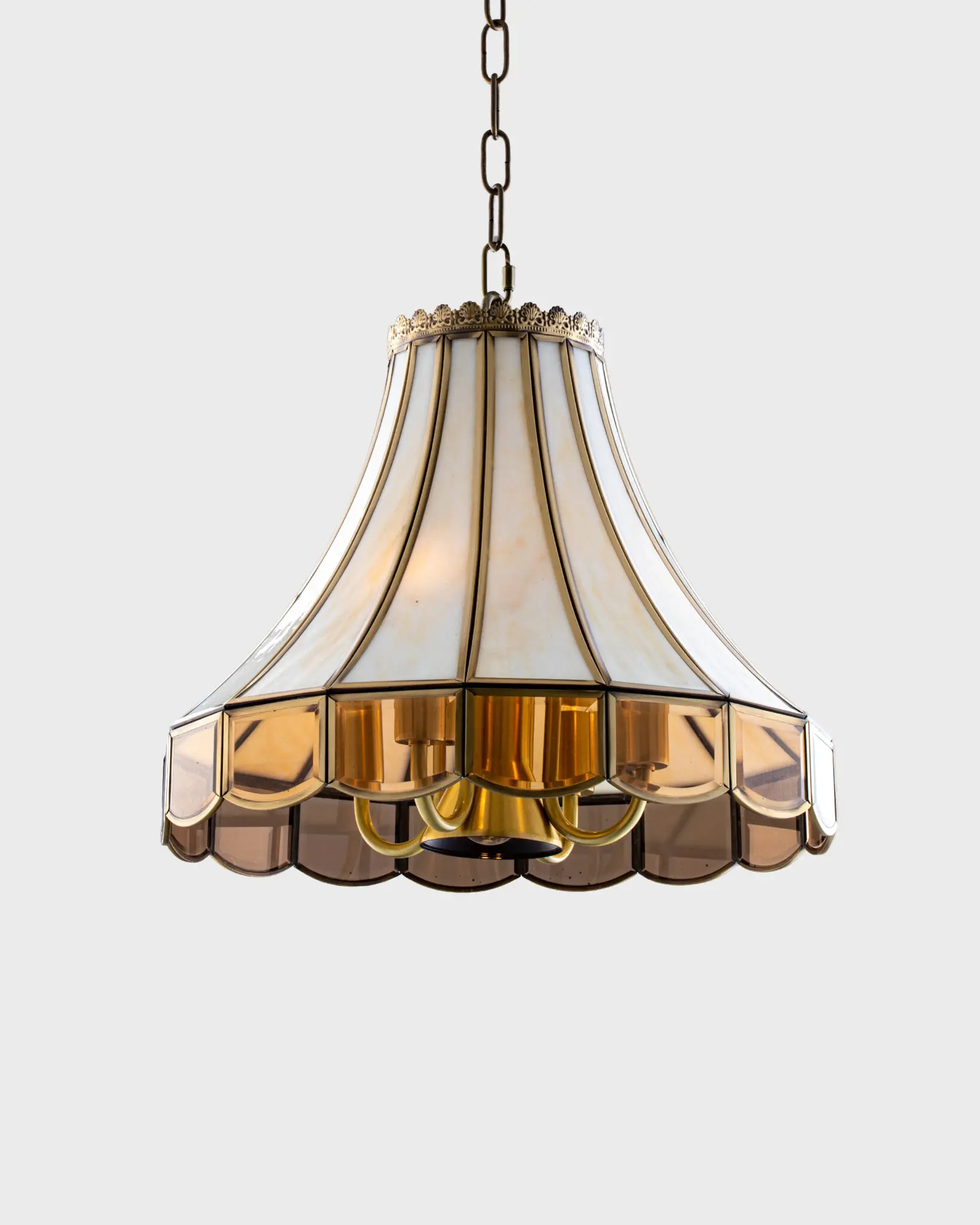 Nâng đỡ phần chao kính là hệ thống khung xương và dây xích treo bằng hợp kim mạ đồng giả cổ (Antique Bronze). Màu đồng trầm mặc, không quá bóng bẩy nhưng lại toát lên vẻ uy quyền và bền bỉ. Đặc biệt, phần đỉnh chao đèn được trang trí bằng một vòng “vương miện” với các họa tiết hoa văn dập nổi tinh xảo. Chi tiết nhỏ này cho thấy sự chăm chút kỹ lưỡng của nhà sản xuất, biến chiếc đèn thả đồng thành một món đồ trang sức thực thụ cho trần nhà.