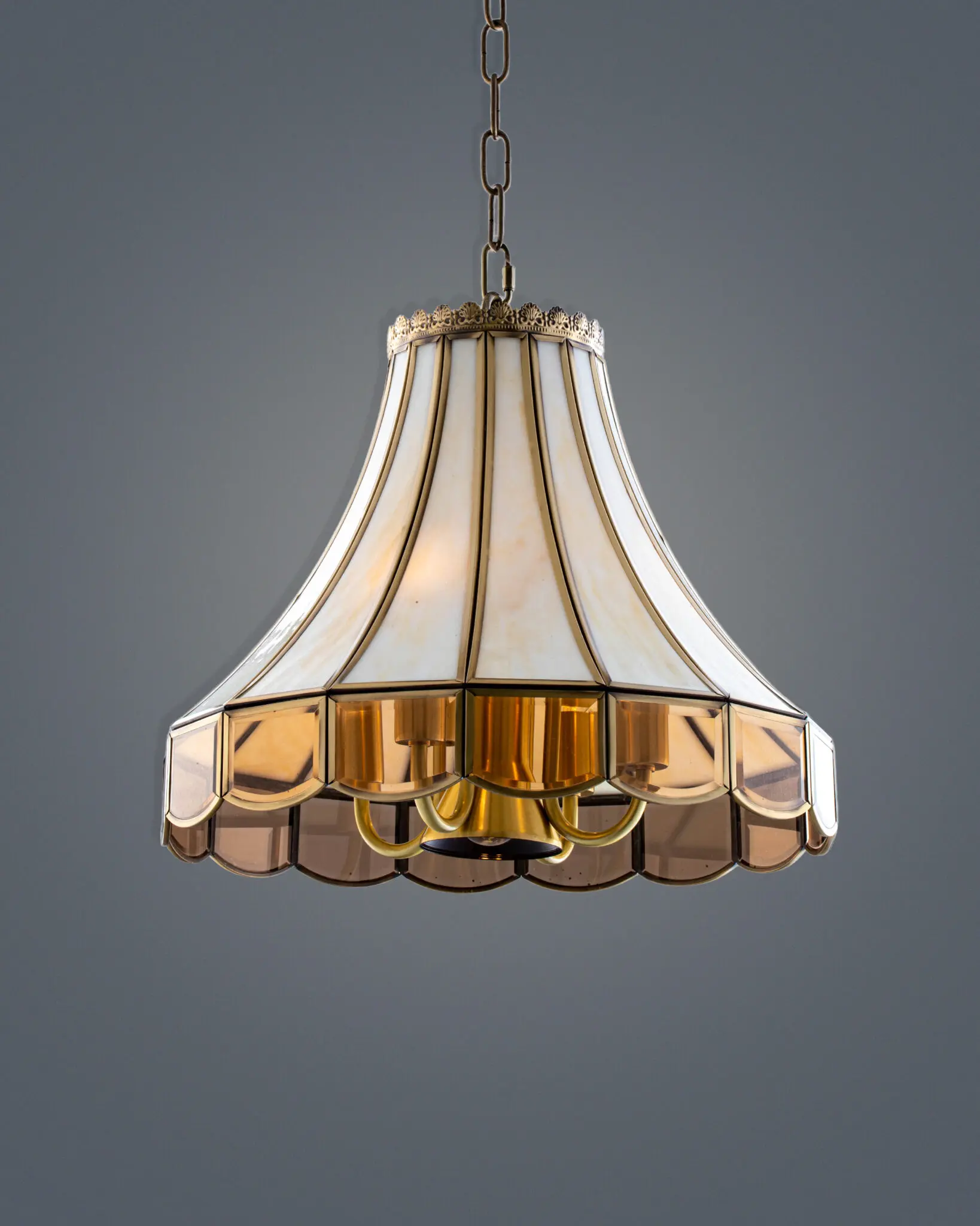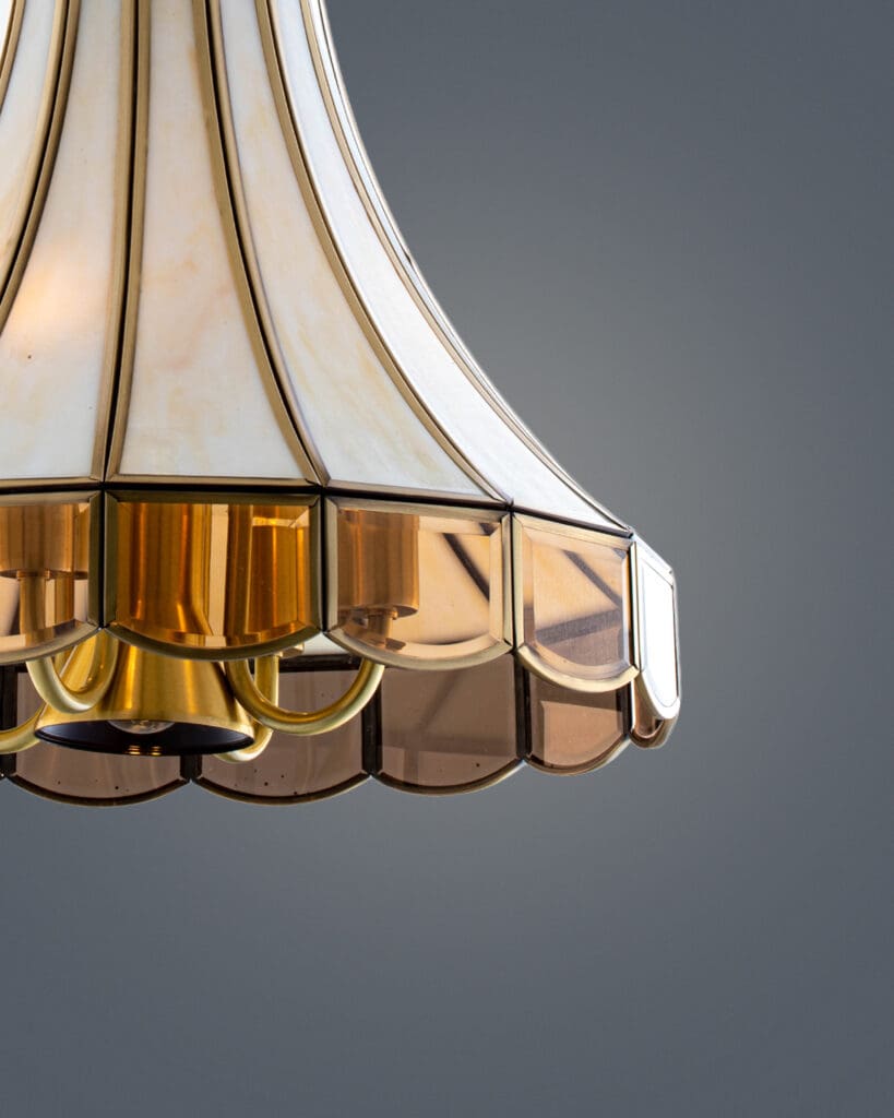 Phần viền chao: Điểm nhấn nằm ở phần viền dưới uốn lượn hình sóng, sử dụng kính màu nâu hổ phách hoặc màu trà. Khi đèn bật sáng, phần viền này rực lên như những viên đá quý, tạo nên hiệu ứng thị giác vô cùng bắt mắt và sang trọng.