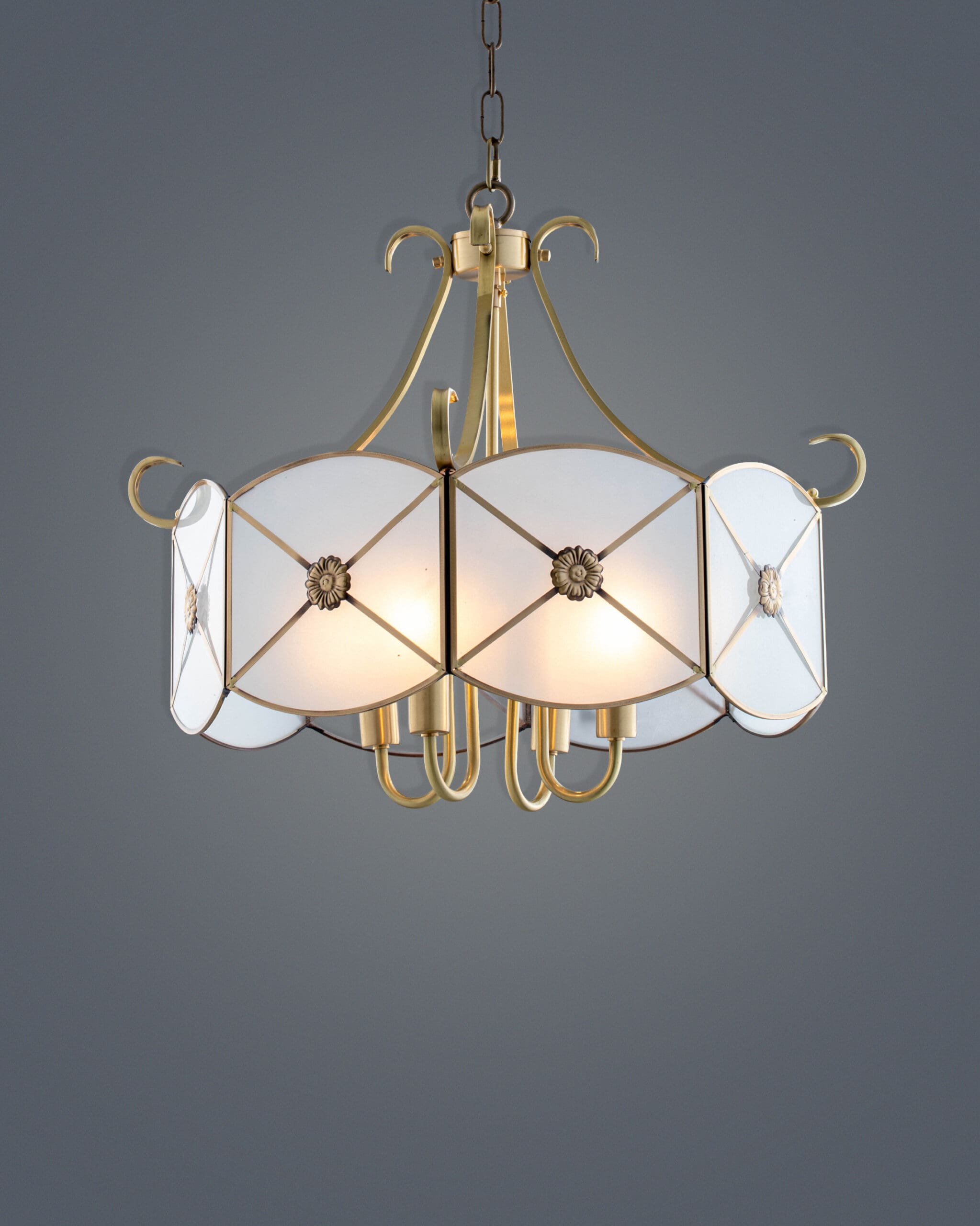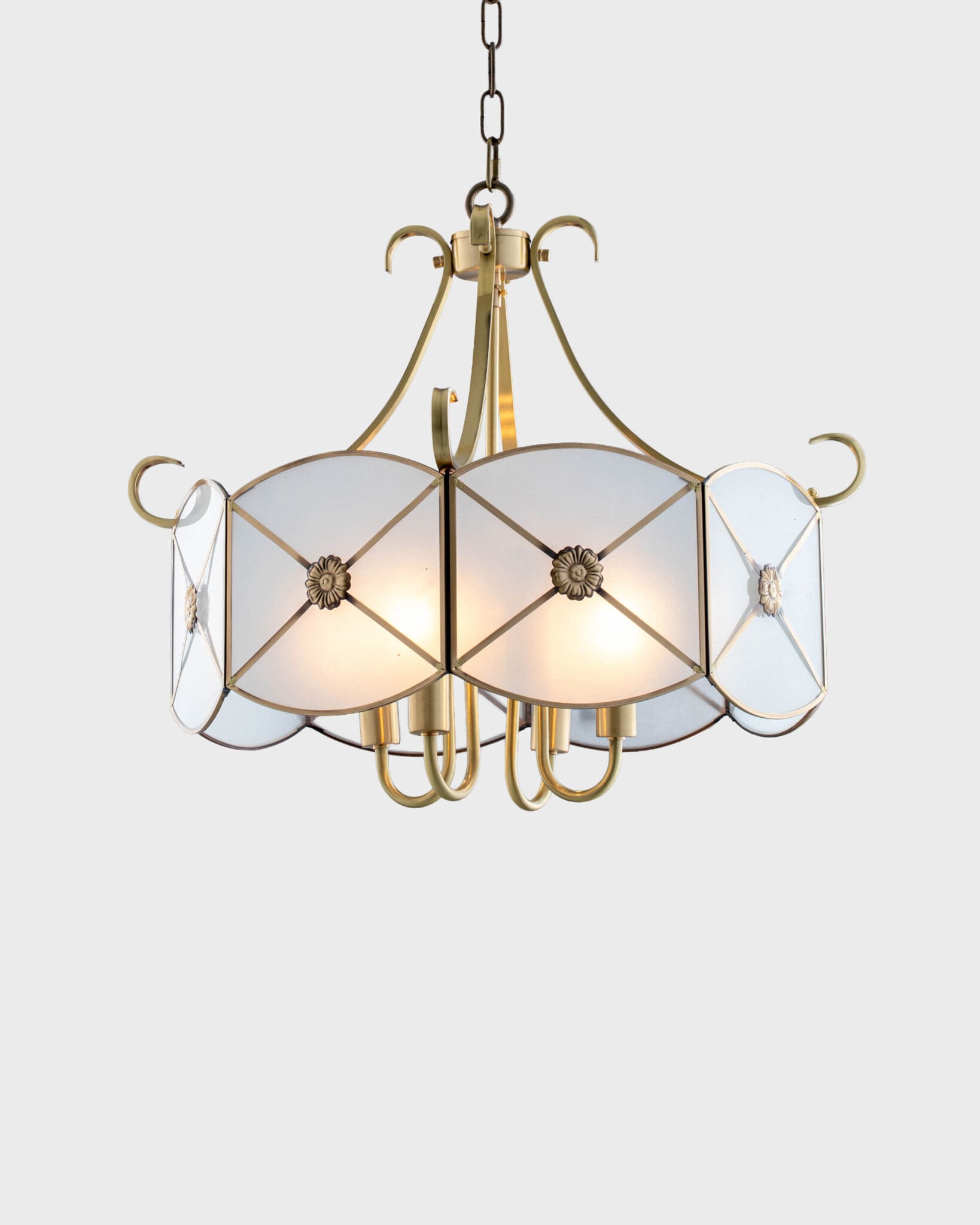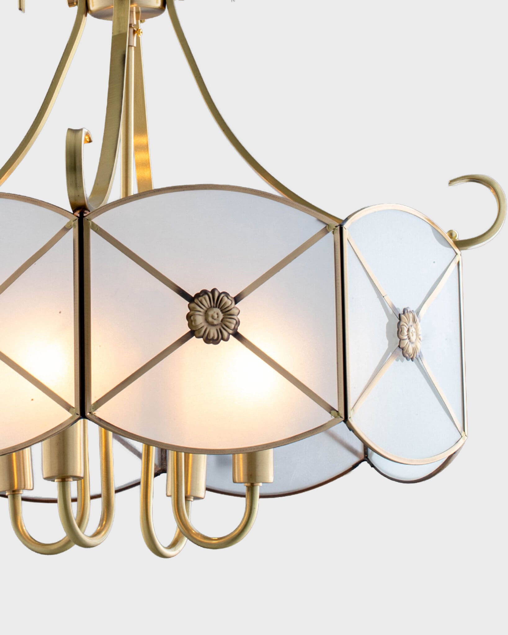Điểm nhấn đắt giá nhất của VRG-CD9060-4 chính là lớp chao đèn làm từ kính mờ (Frosted Glass). Khác với kính trong suốt, kính mờ có tác dụng làm mềm ánh sáng, che đi khuyết điểm của bóng đèn bên trong. Trên mỗi tấm kính là những đường viền kim loại chạy chéo hình chữ X, hội tụ tại trung tâm là một đóa hoa bằng đồng được chạm khắc tỉ mỉ. Chi tiết này không chỉ có tác dụng trang trí mà còn giúp gia cố độ bền cho chao đèn. Khi đèn bật sáng, những họa tiết này hiện lên rõ nét, in bóng lên trần và tường nhà như một bức tranh điêu khắc ánh sáng đầy mê hoặc.