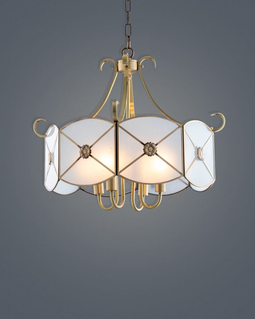 Bộ khung xương của đèn đóng vai trò như “cột sống” nâng đỡ toàn bộ tác phẩm. Được chế tác từ hợp kim cao cấp và phủ lớp mạ màu đồng vàng (Gold Bronze), khung đèn toát lên vẻ quyền quý và vương giả. Màu đồng không rực rỡ chói lòa như vàng 24K, mà có độ đầm, độ sâu nhất định, gợi nhắc đến những món đồ nội thất trong các dinh thự quý tộc xưa. Các chi tiết tay treo phía trên được uốn cong mềm mại như những dải lụa, giúp cân bằng lại sự cứng cáp của phần lồng đèn bên dưới, tạo nên một tổng thể hài hòa về mặt thị giác.
