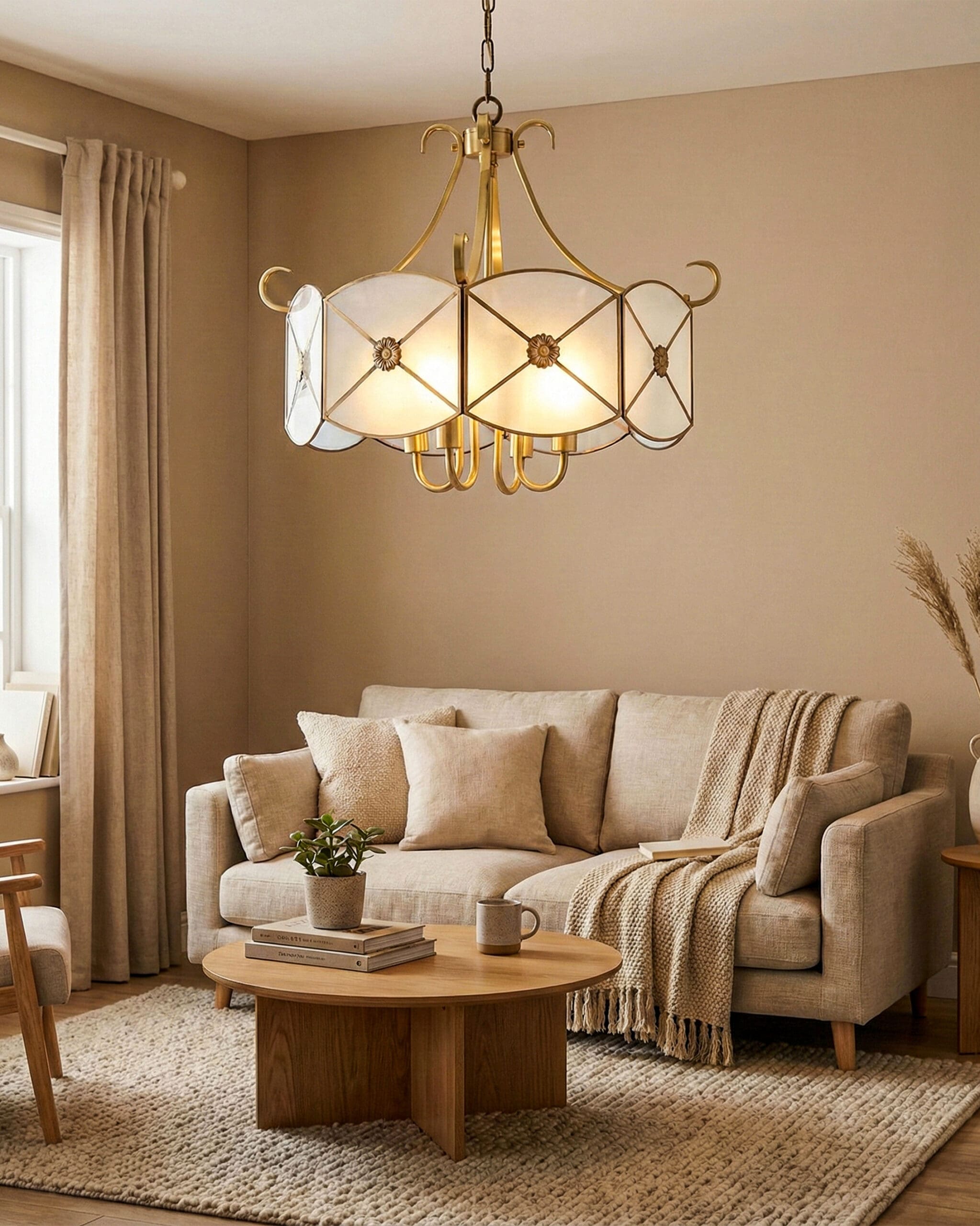 Đây là “sân khấu” lý tưởng nhất cho mẫu đèn này. Sự kết hợp giữa chất liệu kim loại màu đồng và kính mờ rất ăn nhập với gạch bông, gỗ tự nhiên, mây tre đan… những vật liệu đặc trưng của phong cách Indochine. Treo chiếc đèn này giữa phòng khách, nó sẽ khơi gợi lại ký ức về một Sài Gòn xưa hay một Hà Nội hào hoa, thanh lịch.