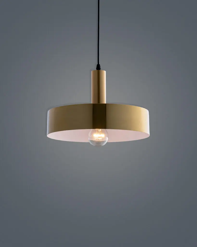 Khác với màu vàng bóng (Glossy Gold) thường gây cảm giác phô trương, màu vàng đồng xước của chiếc đèn thả bàn ăn này mang lại cảm giác trầm ổn, lì và cực kỳ sang trọng. Bề mặt kim loại được xử lý phay xước (brushed) giúp đèn có khả năng bắt sáng tốt nhưng không gây lóa, đồng thời hạn chế tối đa việc bám dấu vân tay hay vết xước dăm trong quá trình sử dụng. Tông màu này cực kỳ dễ phối hợp nội thất. Nó có thể làm điểm nhấn nổi bật trên nền tường trắng, xám bê tông hoặc hòa quyện tuyệt vời với nội thất gỗ sẫm màu.