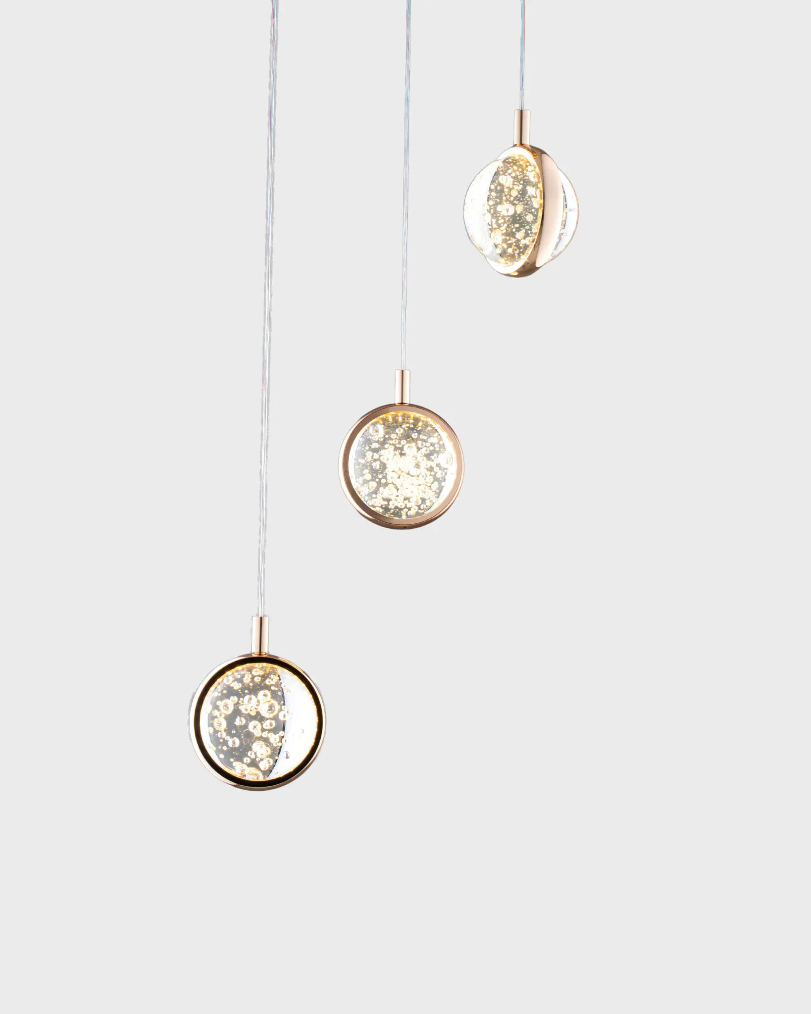 Sự kết hợp hoàn hảo giữa khối pha lê bọt khí trong suốt và vòng kim loại màu Vàng Hồng (Rose Gold) thời thượng đã tạo nên một sản phẩm không chỉ để chiếu sáng, mà còn để chiêm ngưỡng và tận hưởng.