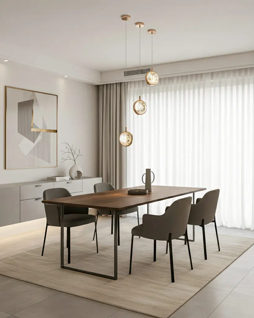 Treo một bộ 3 đèn thả VRG-TH8226 theo đường thẳng hoặc treo cụm tròn tại khu vực bàn ăn là một ý tưởng tuyệt vời. Ánh sáng tập trung xuống món ăn, cộng với hiệu ứng lấp lánh sẽ kích thích vị giác và tạo không khí ấm cúng cho bữa cơm gia đình. Với thiết kế nhỏ gọn, đèn không chắn tầm nhìn, giúp không gian phòng ăn luôn thoáng đãng và rộng rãi.