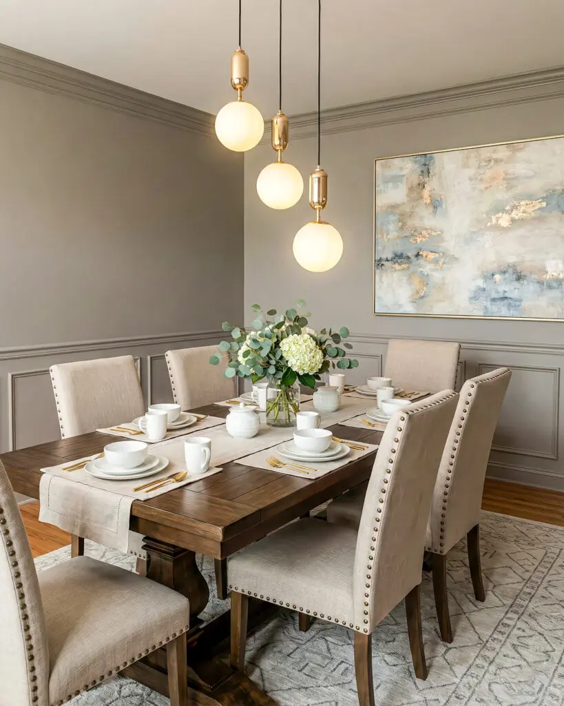 Nếu bạn sở hữu một chiếc bàn ăn dài hình chữ nhật, bạn có thể treo 3 đèn thẳng hàng với độ cao bằng nhau. Cách bài trí này mang lại vẻ đẹp của sự trật tự, ngăn nắp và trang trọng, phù hợp với những không gian tối giản (Minimalist).