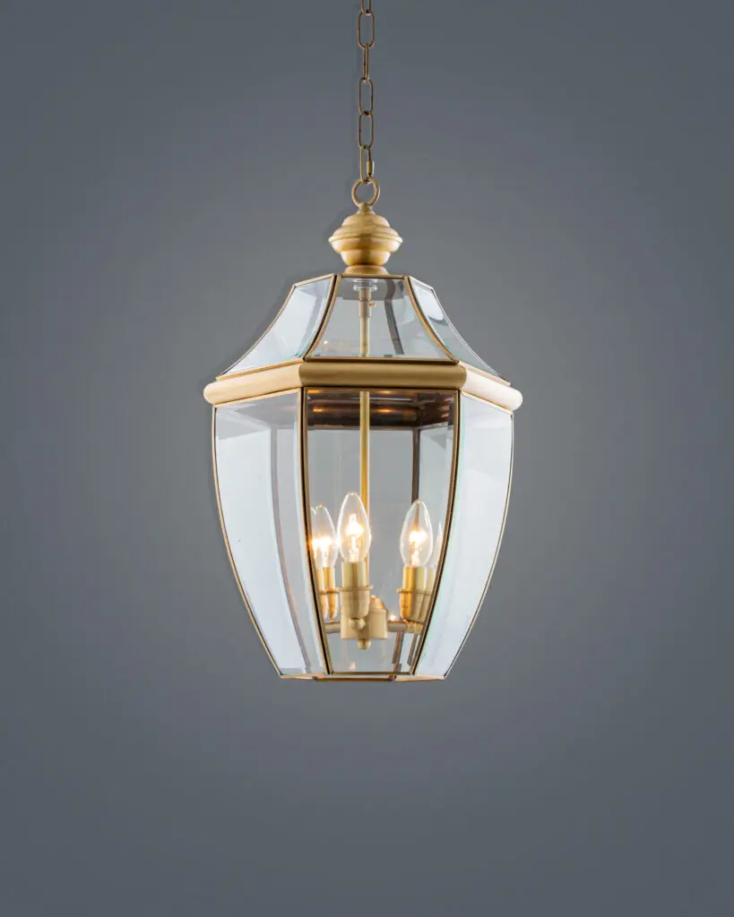 Bộ khung của đèn được chế tác từ hợp kim cao cấp, phủ lớp mạ màu đồng vàng (Brass) hoặc vàng xước nhẹ. Màu sắc này không chói lóa như vàng 24K mà có độ trầm, độ “đầm” nhất định, gợi lên vẻ đẹp của thời gian. Các đường viền kim loại được gia công sắc sảo, lắp ghép tạo thành hình khối lục giác hoặc bát giác cân xứng. Phần mái đèn và đáy đèn được bo viền dày dặn, tạo cảm giác vững chãi, kiên cố như một tòa lâu đài thu nhỏ.