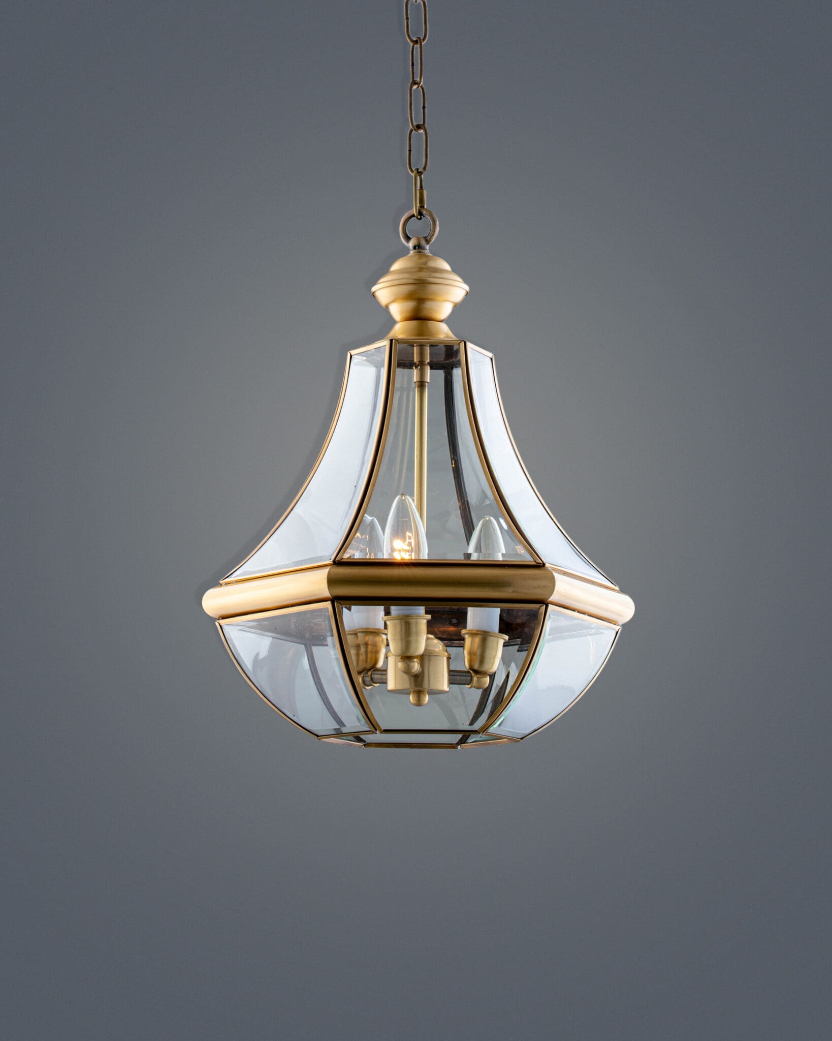 Bộ khung của đèn được chế tác từ hợp kim cao cấp, phủ lớp mạ màu đồng vàng (Brass) sang trọng. Màu sắc này không quá chói lóa như vàng kim, mà có độ trầm nhất định, rất phù hợp với những không gian cần sự tĩnh lặng và chiều sâu. Các thanh kim loại được uốn cong nhẹ nhàng, ôm lấy phần bầu kính, tạo nên một kết cấu hài hòa và cân đối. Phần chóp đèn và đáy đèn được gia công tỉ mỉ với các đường phào chỉ tinh tế, thể hiện sự chỉn chu trong từng chi tiết nhỏ nhất.