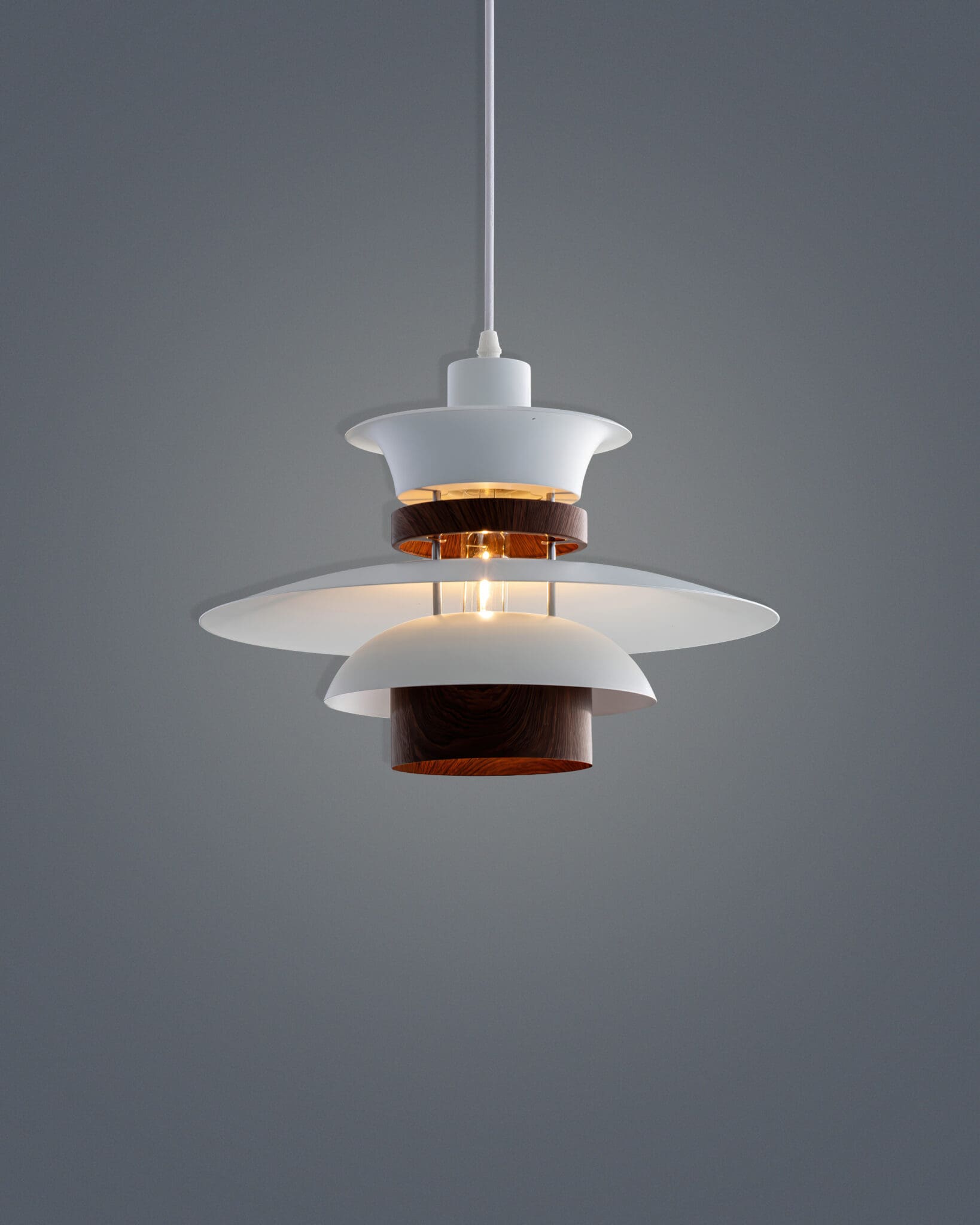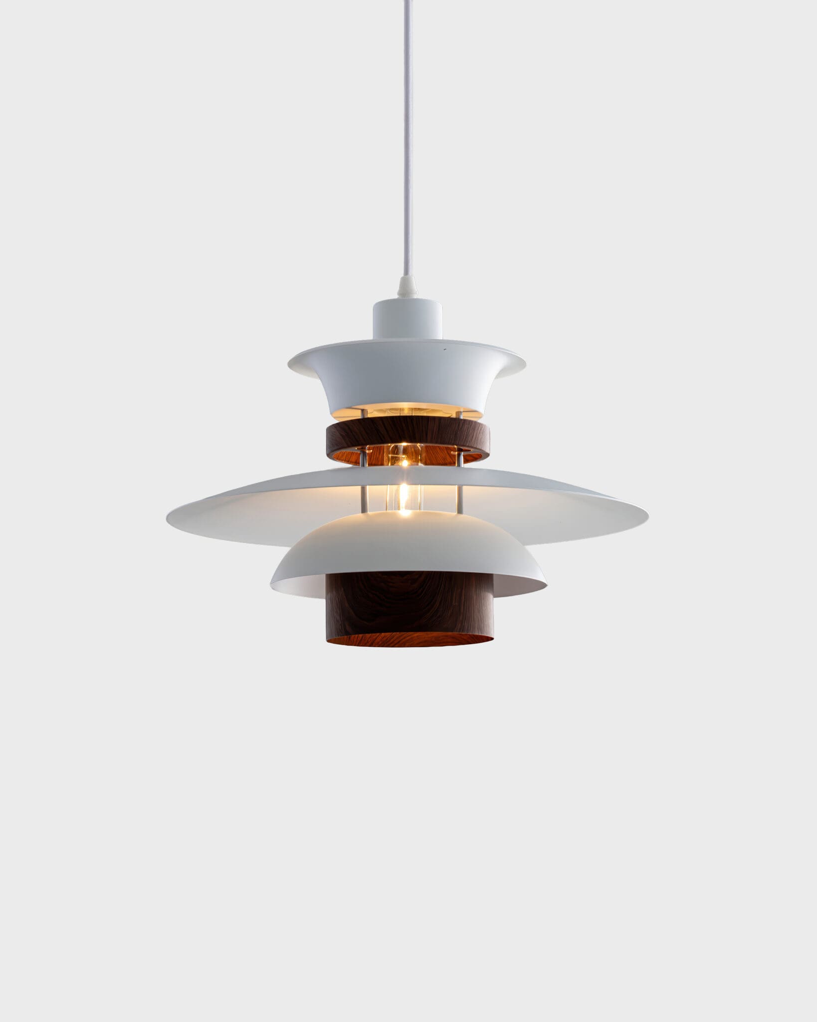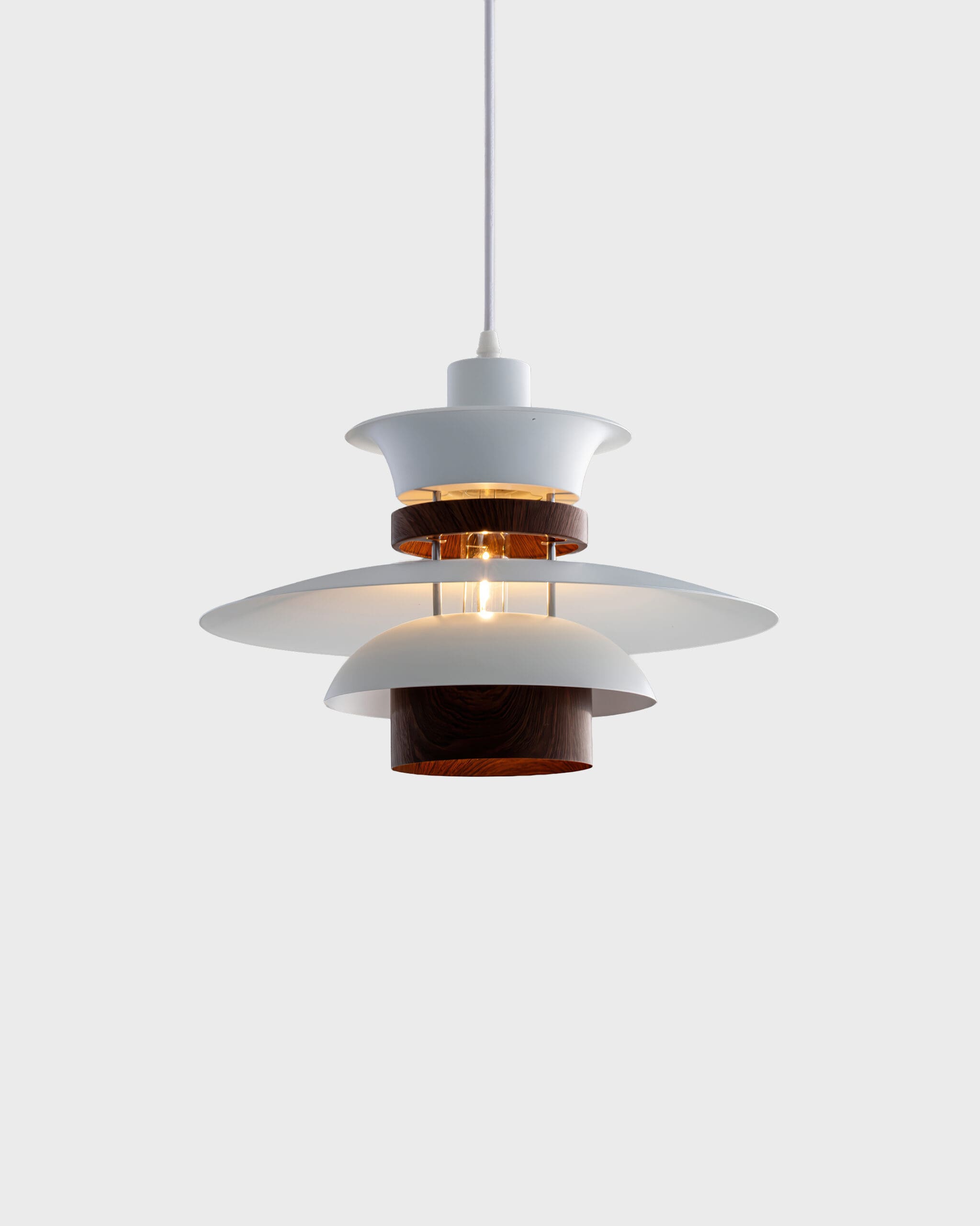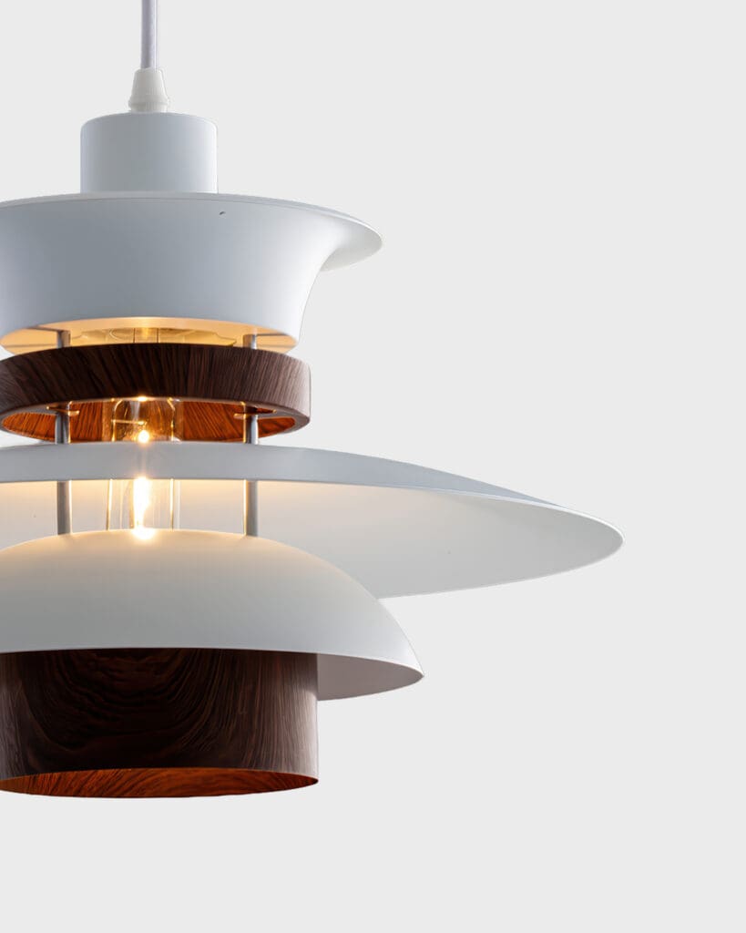 Vân Gỗ (Wood Grain): Điểm xuyết giữa các lớp trắng là những vòng đai hoặc chao nhỏ mang màu sắc vân gỗ óc chó (Walnut) sang trọng. Chi tiết “giả gỗ” này chính là điểm nhấn đắt giá, phá tan sự lạnh lẽo của kim loại, thổi hồn thiên nhiên ấm áp vào chiếc đèn thả bàn ăn.