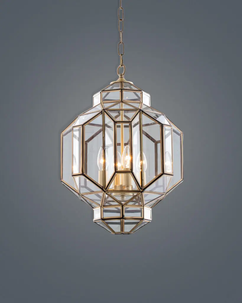 Điền vào giữa các khung kim loại là những tấm kính trong suốt (Clear Glass) dày dặn. Việc sử dụng kính trong giúp phô diễn toàn bộ vẻ đẹp của cụm đèn nến bên trong, đồng thời cho phép ánh sáng tỏa ra mạnh mẽ nhất. Dưới tác động của ánh sáng, các góc cạnh của khung đèn và mặt kính tạo ra những hiệu ứng phản xạ và khúc xạ thú vị. Nhìn từ xa, chiếc đèn thả đồng này lấp lánh như một viên pha lê khổng lồ, thu hút mọi ánh nhìn ngay từ khi bước vào căn phòng.