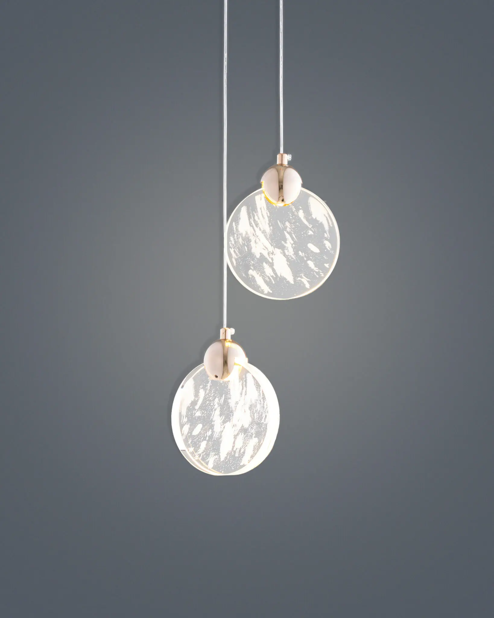 Thay vì sử dụng thủy tinh trong suốt đơn điệu, mẫu đèn thả pha lê này sử dụng tấm Acrylic quang học hoặc pha lê đặc biệt được khắc laser 3D bên trong. Những đường vân ngẫu nhiên tạo nên hình ảnh của những dải mây khói mờ ảo hoặc những bọt khí đang sủi tăm. Khi đèn chưa bật, nó trong trẻo và tinh khôi. Khi ánh sáng đi qua, các vân mây này bắt sáng và rực lên, tạo độ sâu thăm thẳm. Nhìn vào chiếc đèn, người ta có cảm giác như đang ngắm nhìn một tiểu vũ trụ thu nhỏ hay bề mặt của một hành tinh xa xôi nào đó.