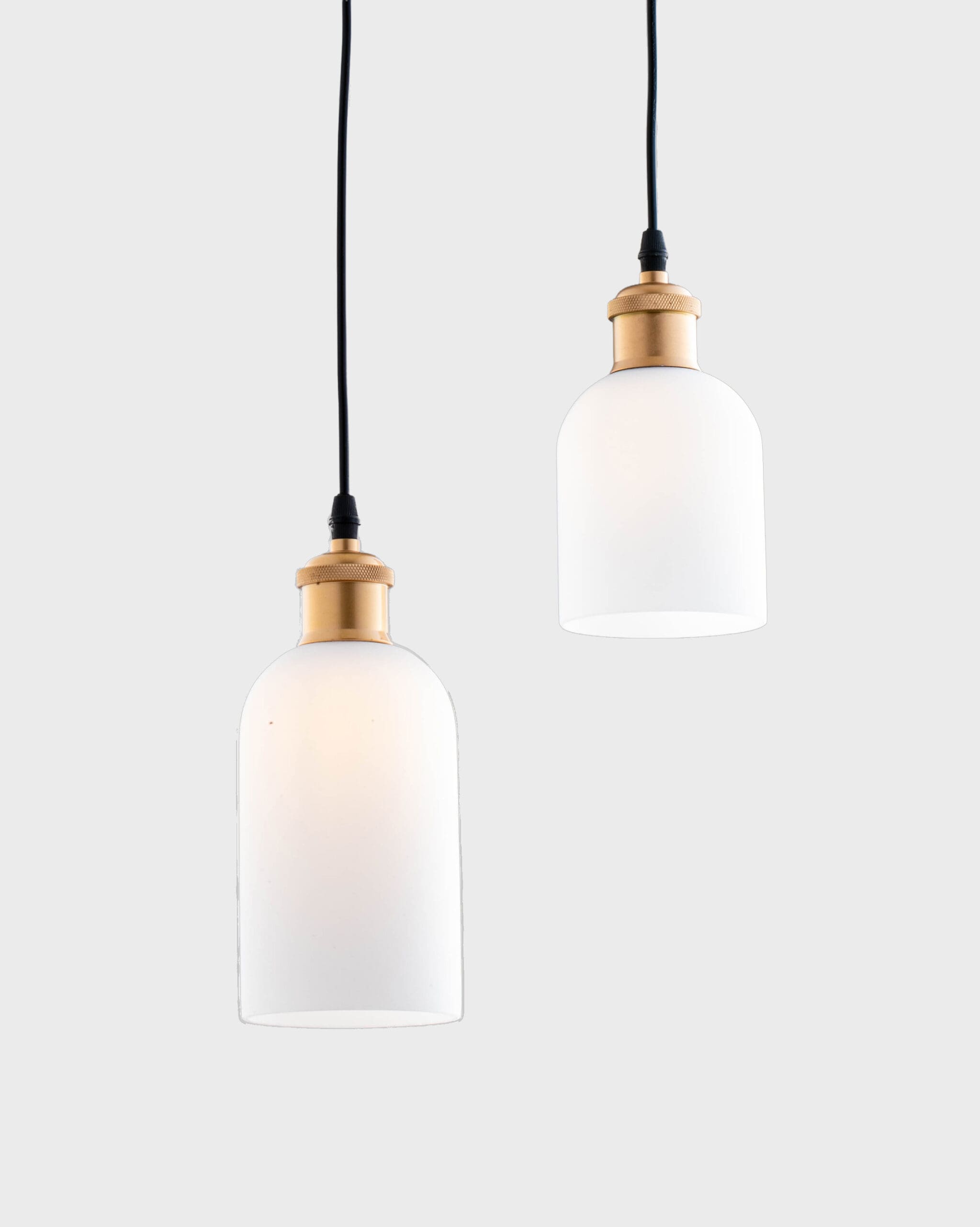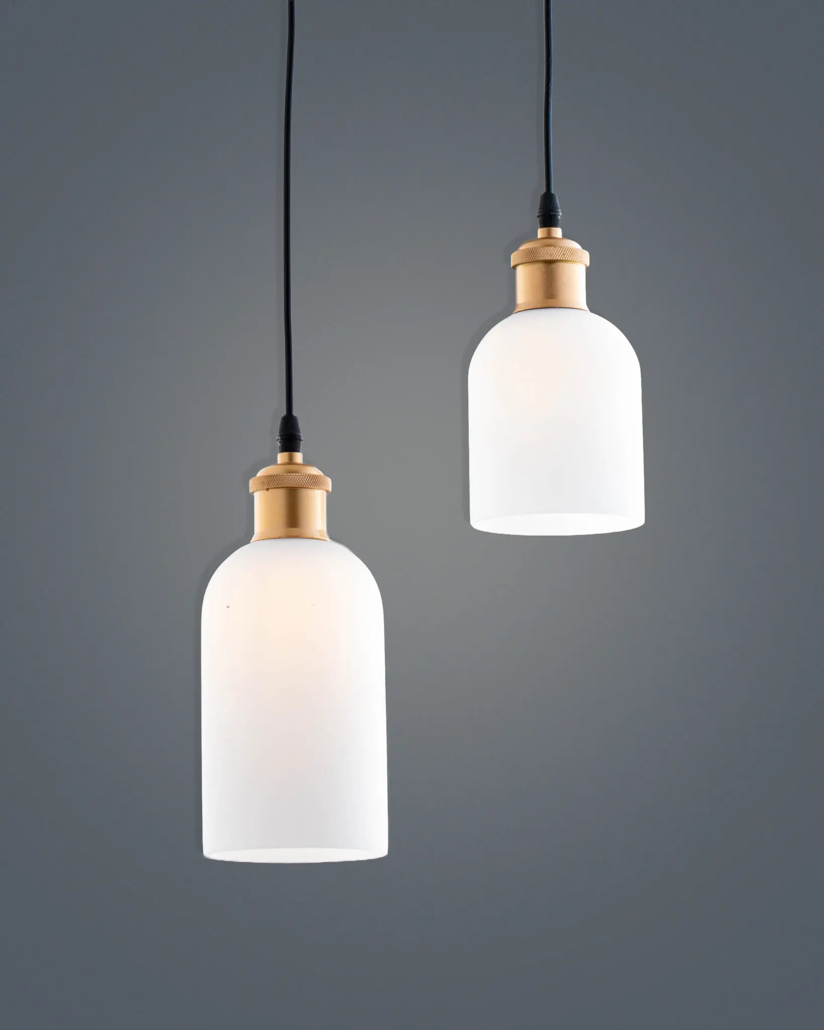 Để chiếc đèn không bị đơn điệu với một màu trắng, các nhà thiết kế đã khéo léo kết hợp với phần đui đèn bằng kim loại mạ màu Vàng Đồng (Brass/Gold). Điểm đặc biệt là bề mặt đui đèn được khắc vân nhám (knurled texture) – một chi tiết thường thấy trong các thiết kế cơ khí chính xác hay phong cách Industrial. Chi tiết nhỏ này tạo nên sự tương phản thú vị: giữa sự trơn láng, mong manh của thủy tinh và sự cứng cáp, sắc sảo của kim loại. Màu vàng đồng cũng giúp chiếc đèn thả thủy tinh trở nên ấm áp và sang trọng hơn.