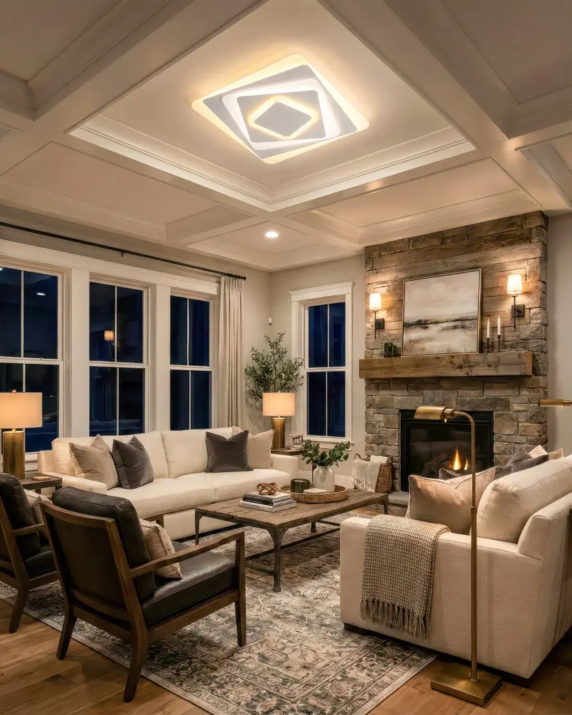 Trong phòng khách, nơi được xem là bộ mặt của ngôi nhà, VRG-ML8550 không chỉ cung cấp ánh sáng mà còn khẳng định phong cách của gia chủ. Nó kết hợp hoàn hảo với sofa da, bàn trà mặt đá, và những gam màu trung tính như xám, trắng, be, tạo nên một tổng thể hài hòa, sang trọng và đầy cuốn hút.