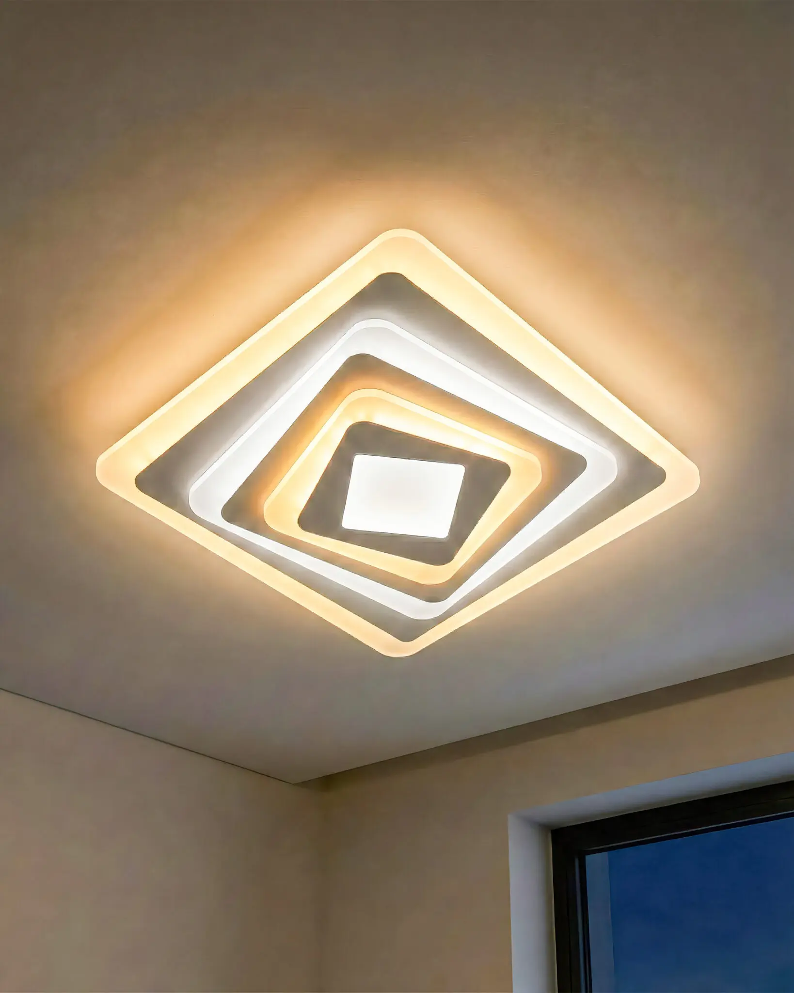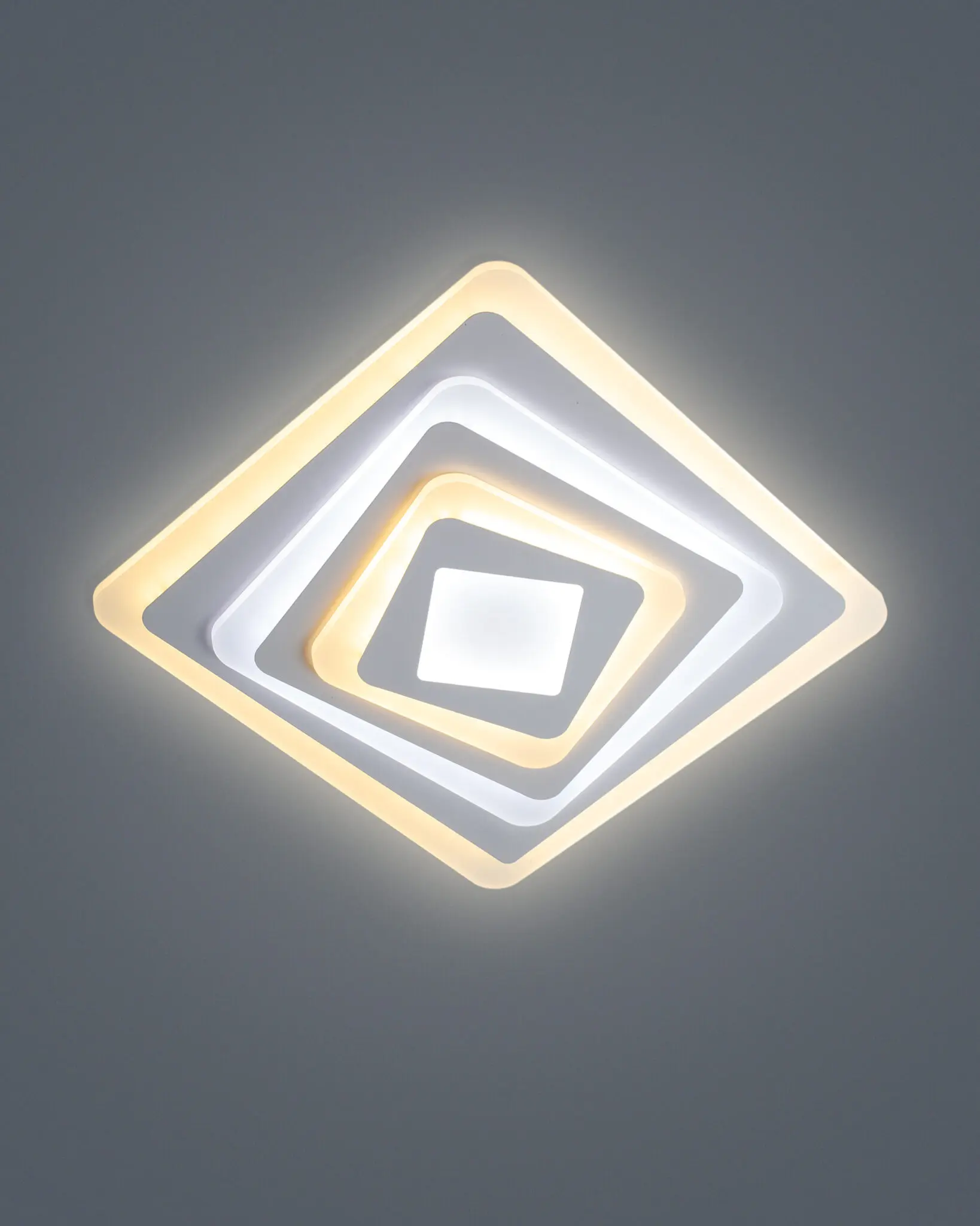 Sản phẩm là sự chồng xếp tinh tế của nhiều lớp hình vuông với các góc được bo tròn mềm mại. Các lớp đèn được sắp đặt xen kẽ, lớp phát sáng vàng ấm áp, lớp phát sáng trắng tinh khôi, tạo nên một nhịp điệu thị giác sống động. Thiết kế này không chỉ khuếch tán ánh sáng hiệu quả mà còn tạo ra một hiệu ứng chiều sâu, khiến chiếc đèn như đang trôi nổi bồng bềnh giữa không trung.